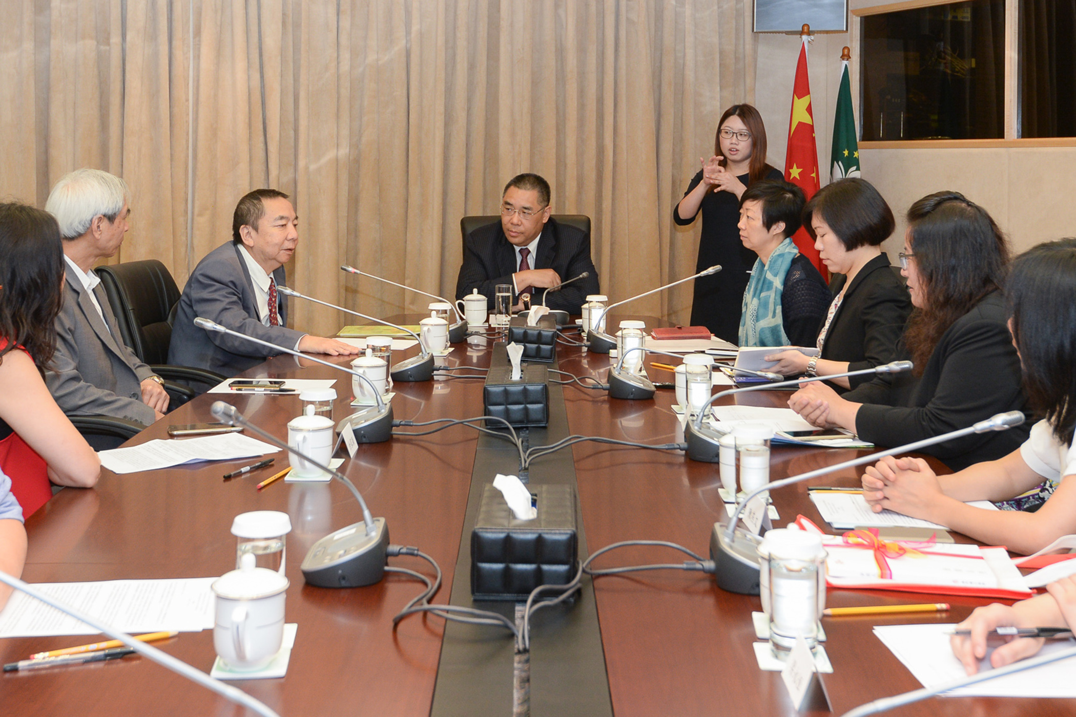 澳門聾人協會榮譽會長馬有仁向行政長官匯報了該會的會務狀況及發展方向,並感謝特區政府對聽障人士的關愛。會員大會主席余家頴表示,感謝特區政府歷年來對該會以及聽障人士的支持和鼓勵。她指,特區政府一直把資源投放在支持聽障人士及復康服務上,使該會有機會參與、組織和推動聽障人士的服務,共建聾健共融的社會。總幹事劉雪雯表示,推動手語普及、宣傳《殘疾人權利公約》、提高聾人的社會地位,以及增強該會在世界聾人聯合會亞洲區內的工作和地位等,都是該會目前最大的工作目標和使命。