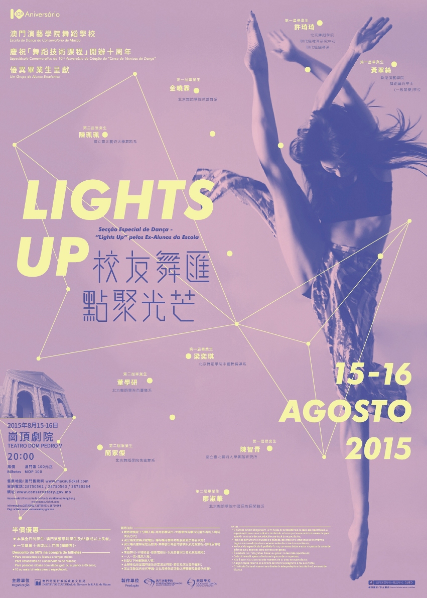 文化局澳門演藝學院舞蹈學校將於八月十五及十六日晚上八時,在崗頂劇院上演舞蹈專場《Lights Up─校友舞匯‧點聚光芒》。藉慶祝“舞蹈技術課程"辦學十周年的時機,爲畢業生提供展現自我的平台,推廣澳門本土的專業舞蹈力量,令更多市民認識專業舞蹈。
