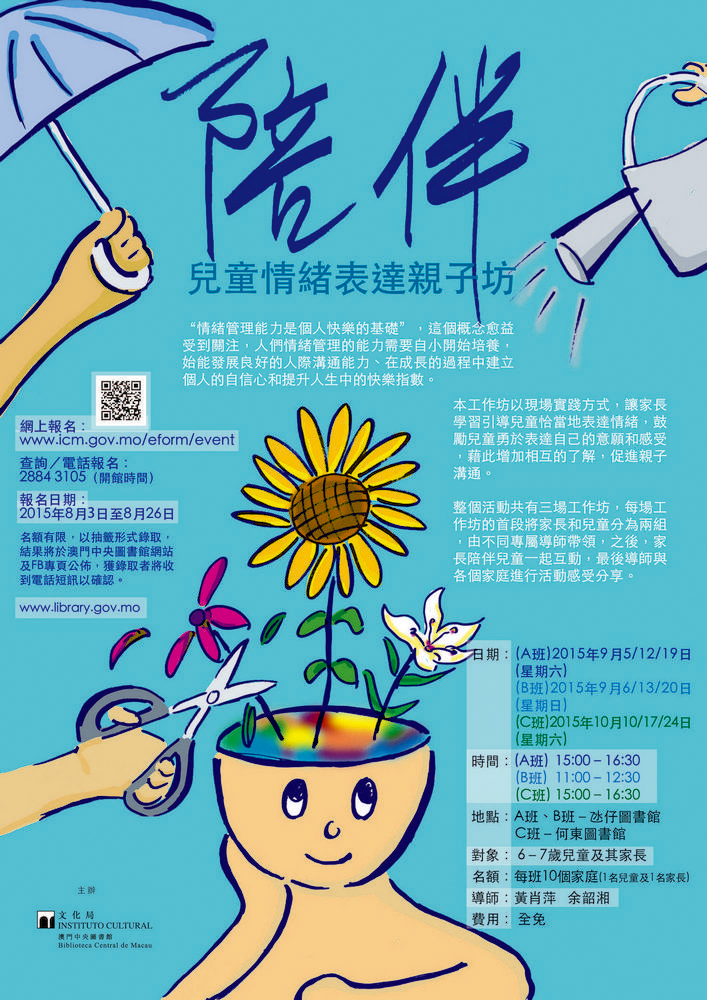 “陪伴—兒童情緒表達親子坊”共設三班,每班為三場,分別為A班:九月五、十二及十九日;B班:九月六、十三及二十日;C班:十月十、十七及二十四日。A班和B班之上課地點為氹仔圖書館,C班為何東圖書館。工作坊適合六至七歲兒童及其家長參加,每班名額十對親子,費用全免,以抽籤形式取錄,有興趣者可由即日起至八月三十日致電或於網上(www.icm.gov.mo/eform/event/c/5/)報名。取錄名單將於八月三十一日在澳門中央圖書館網站公佈,並以短通知。詳情請瀏覽www.library.gov.mo。網上登記網址為,查詢及電話登記可於開館時間致電二八三七七一一七。