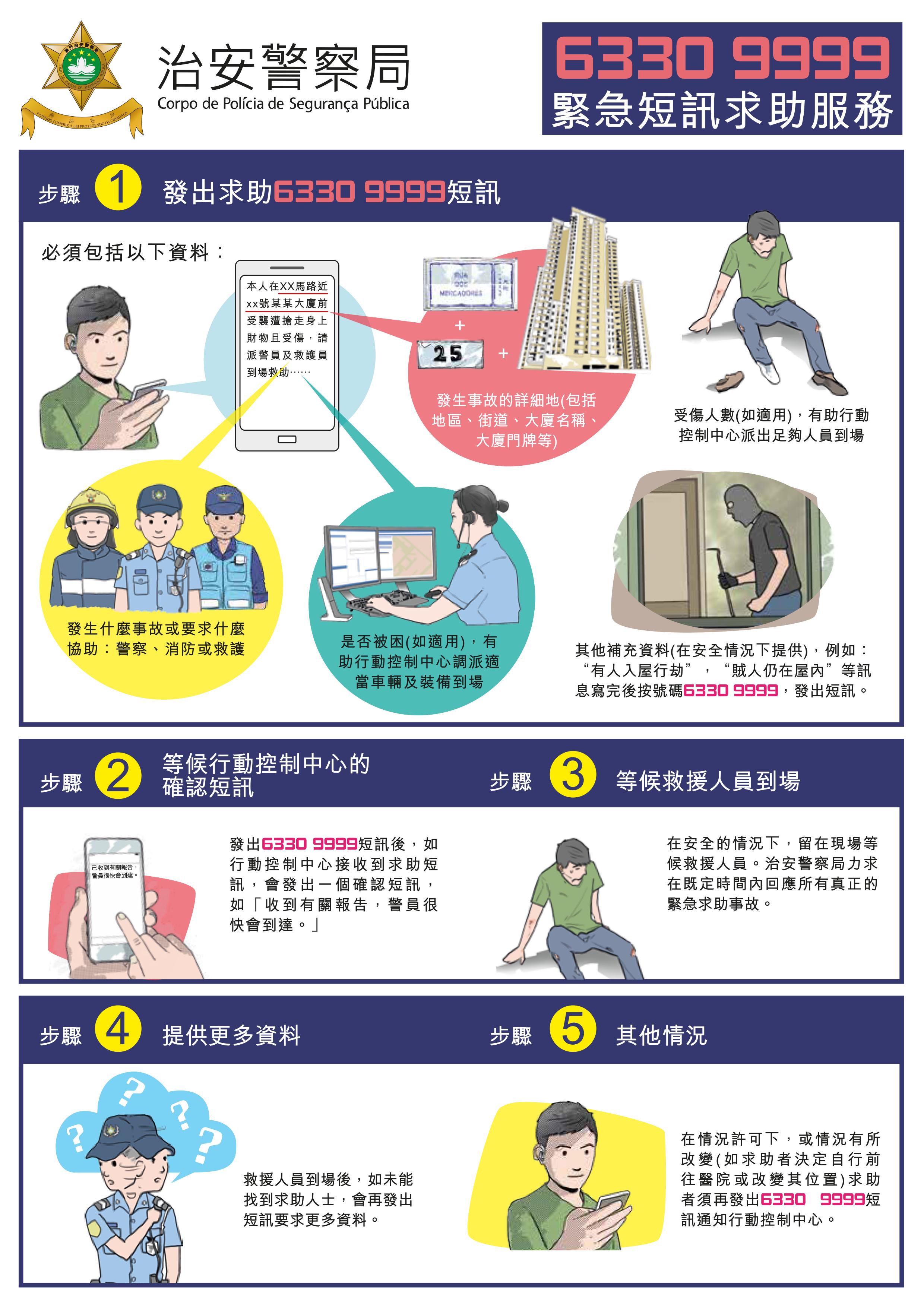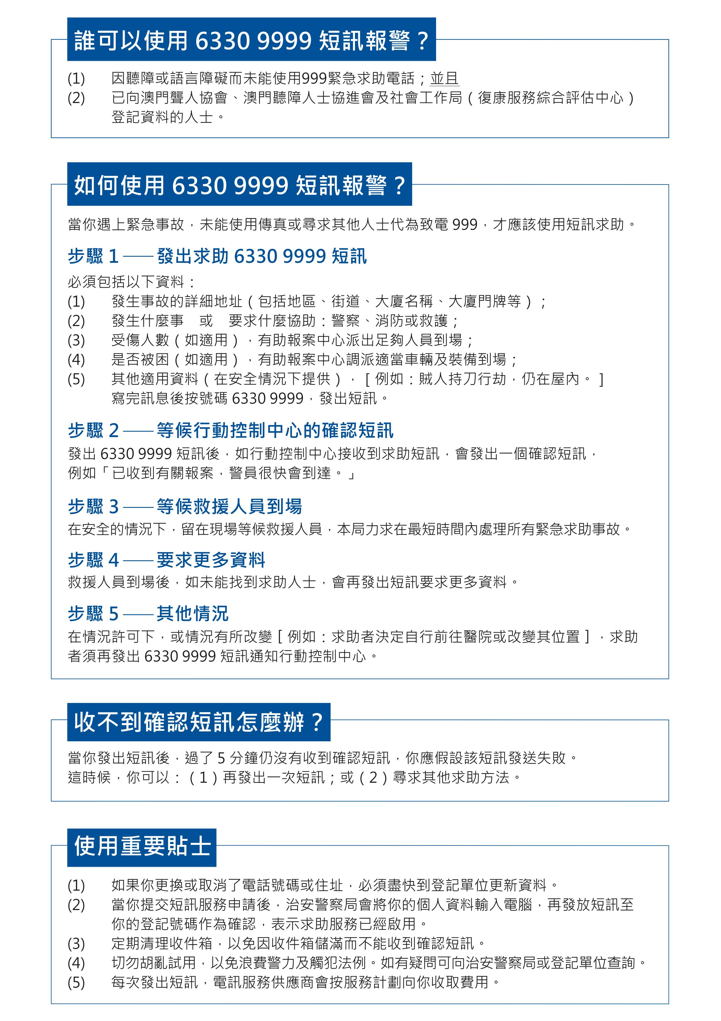 治安警察局將在本年10月1日為聽障及語言障礙人士推出緊急短訊求助服務,屆時,已登記使用相關服務之聽障或語言障礙人士,可透過本澳各電訊公司的電話短訊服務向本局之專線號碼(63309999)發出求助或舉報訊息。