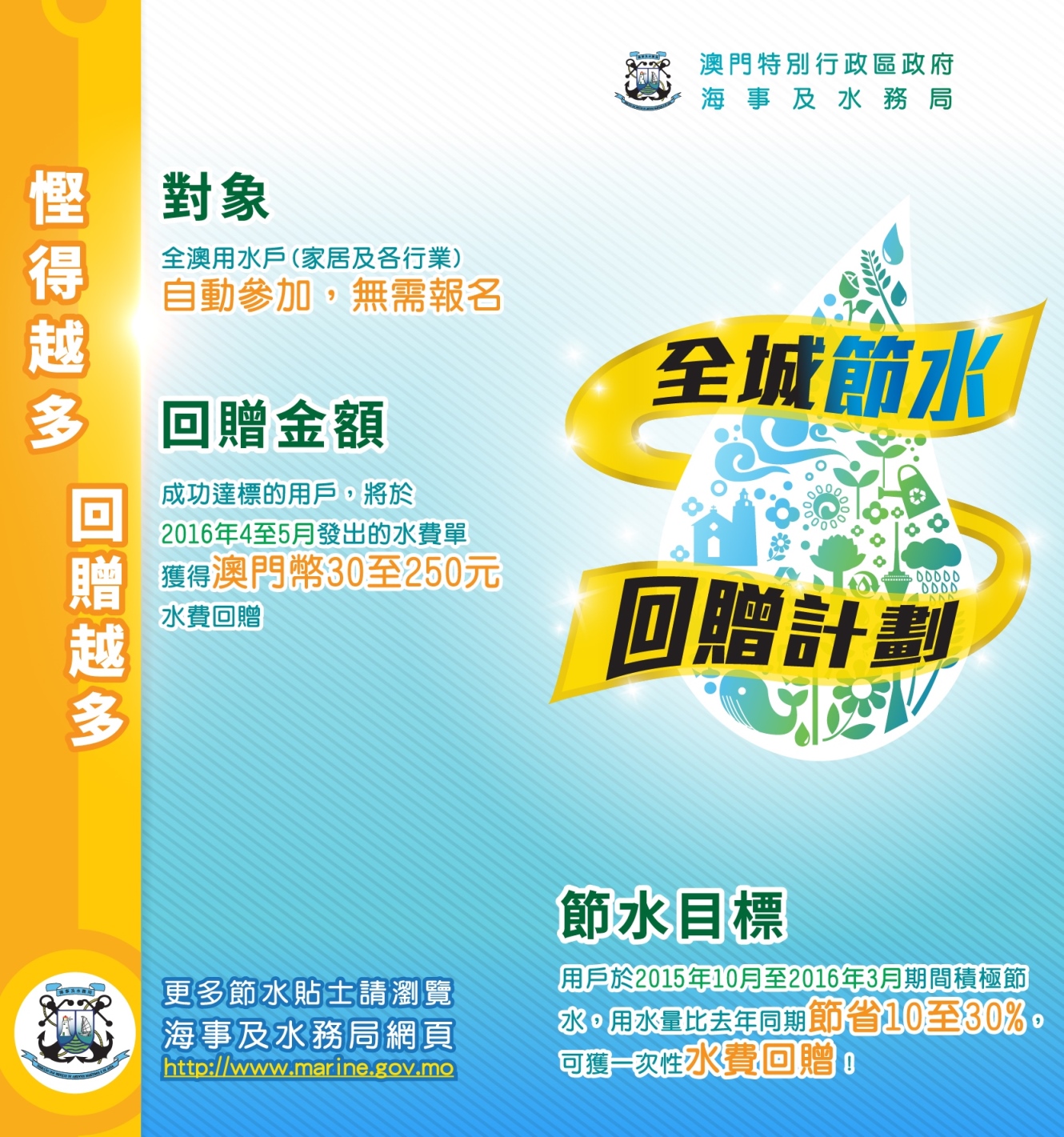 為繼續鼓勵全澳家居及各行各業節約用水,積極應對鹹潮威脅,海事及水務局於2015年10月至2016年3月期間再次推出「全城節水回贈計劃」,全澳用戶的用水量只要比去年同期節約一成至三成,即可獲得水費回贈。回贈金額由澳門幣30元至250元,節水越多,回贈越多。