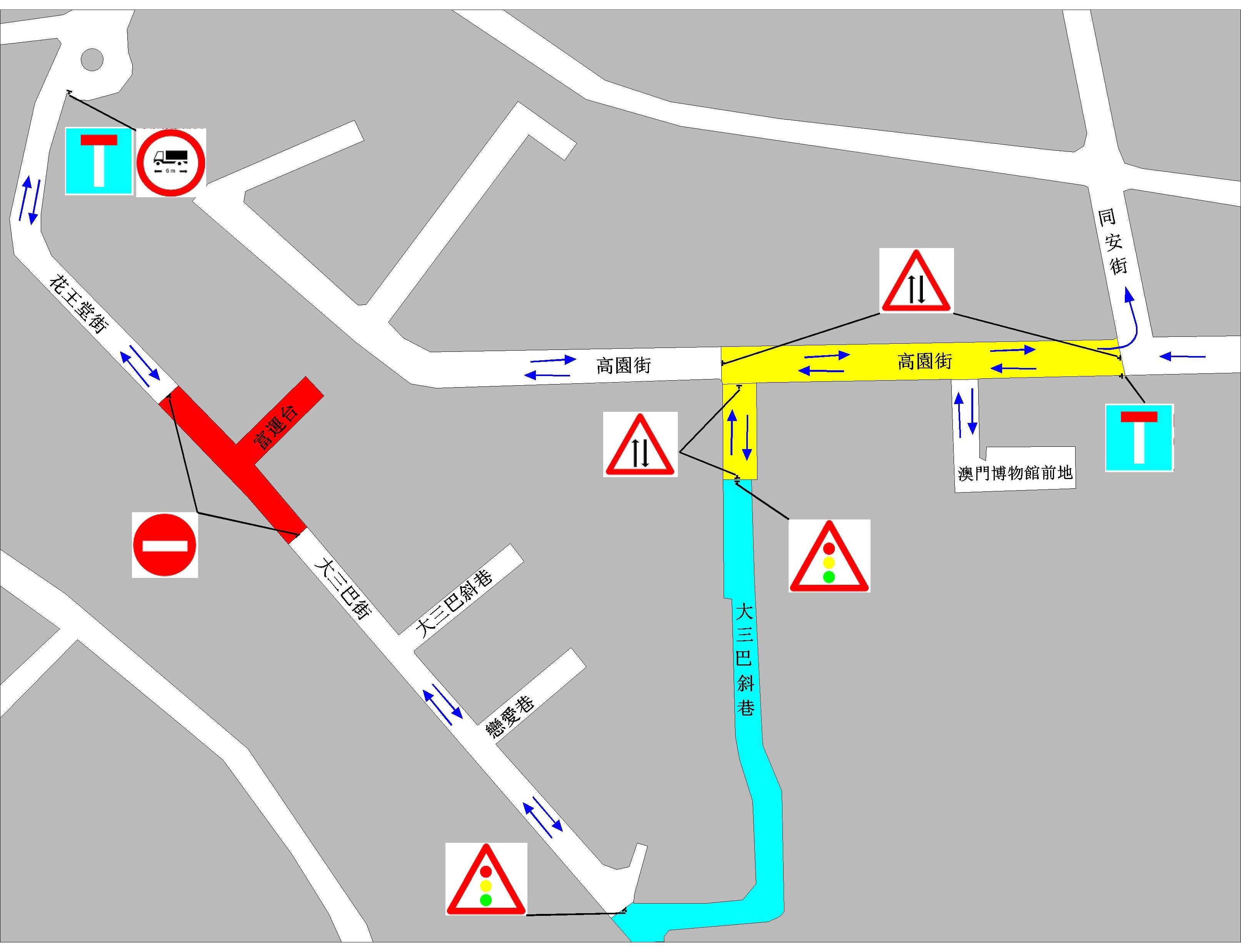 配合工程需要,本月30日(五)上午10時起,大三巴街、花王堂街及富運台交界實施封閉交通;介乎同安街與大三巴斜巷的一段高園街、大三巴斜巷,以及非施工範圍的花王堂街和大三巴街會臨時改雙向交通;並禁止車身長度超過6米之車輛進入花王堂街。由於大三巴斜巷及大三巴巷部份行車道狹窄,為行車安全,交通事務局會設置臨時交通燈,讓往來該路段的雙向車輛利用單一行車道交替輪流行車。上述路段的輕型汽車咪錶泊車位電單車泊車位會暫停使用,而上落貨區則會臨時調整,以方便附近商舖的上落貨需要。