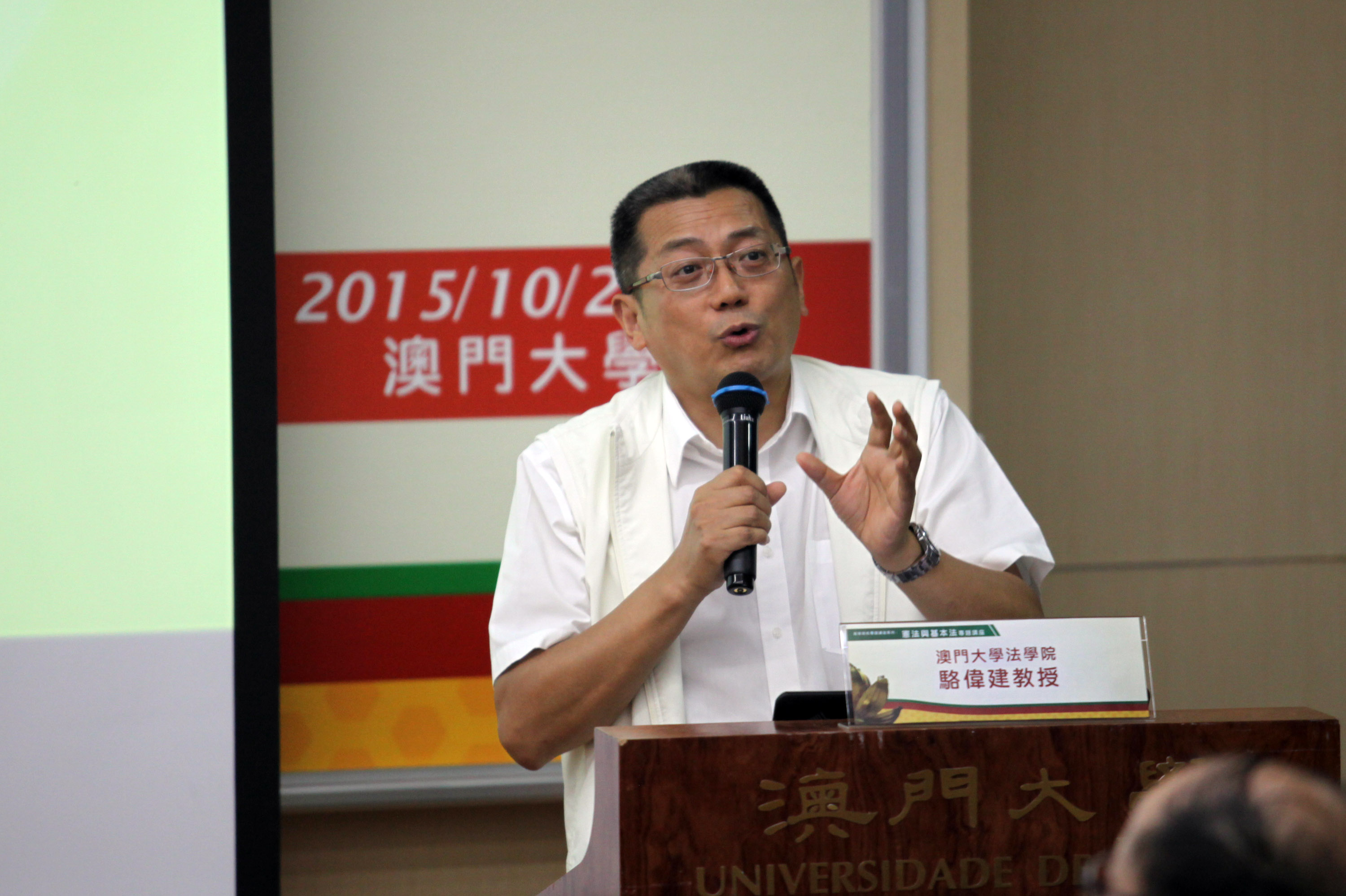 為了加強在高等院校推廣介紹憲法與基本法,讓學生深入理解憲法與基本法的關係,正確認識“一國兩制”的深層意義。法務局今年開始,計劃與本澳多所高等院校合作,舉辦憲法與基本法專題講座及“國是茶聊”小型法律討論會。首場專題講座於昨天(28日)在澳門大學舉行,由澳門大學法學院教授駱偉建主講,就專題內容向出席的學生進行了深入的講解。法務局代局長梁葆瑩、澳門大學法學院院長莫世健、副教授邱庭彪,以及不同學系及年級的學生出席了講座。