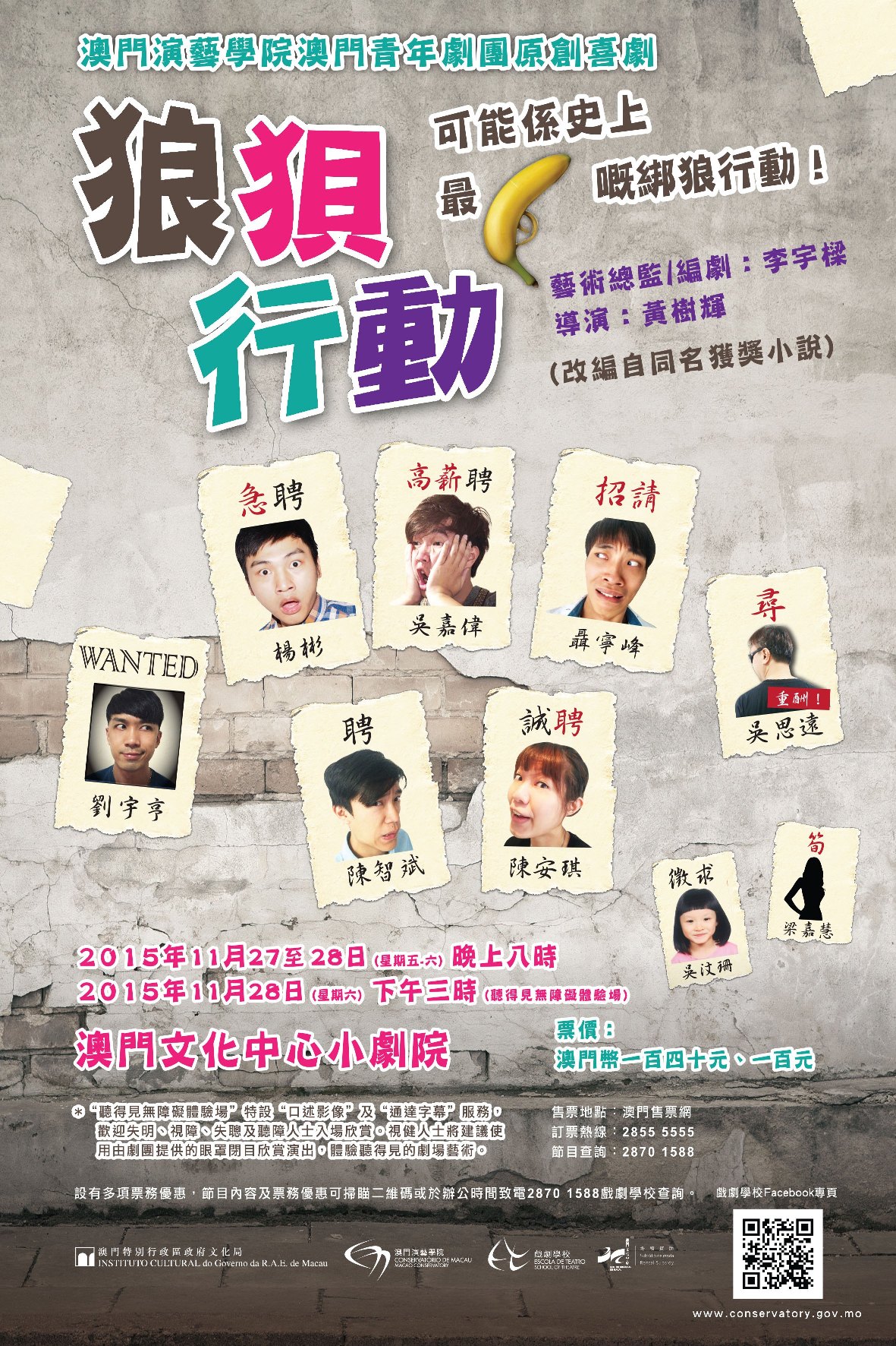 文化局澳門演藝學院澳門青年劇團將於十一月二十七日(星期五)晚上八時及二十八日(星期六)下午三時及晚上八時假文化中心小劇院上演原創喜劇《狼狽行動》,並特設“聽得見無障礙體驗場”提供藝術通達服務。故事講述一場烏龍百出的搞笑綁架案,改編自本澳著名劇作家李宇樑在第一屆澳門文學節小說比賽的冠軍作品,精彩可期。