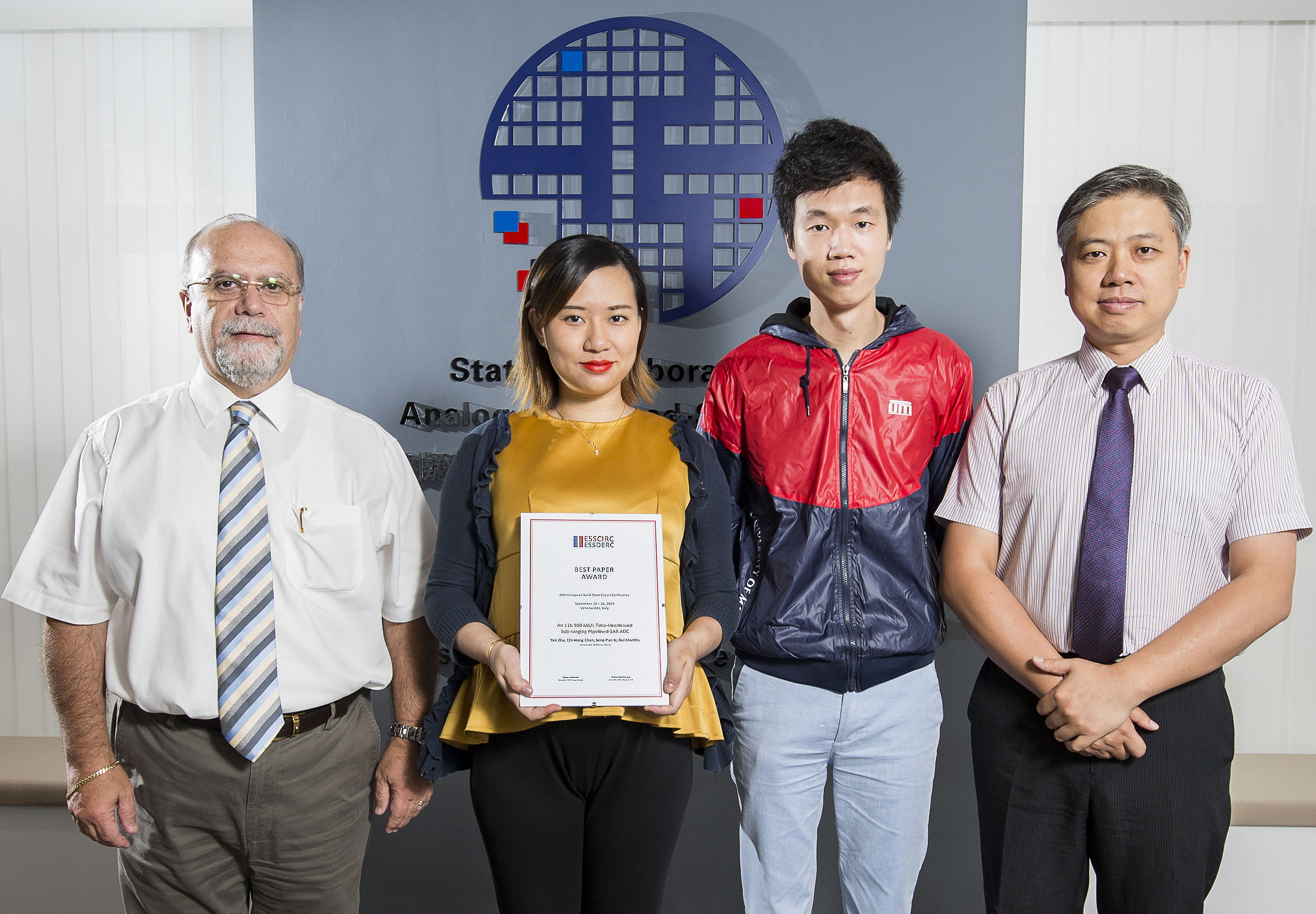 澳門大學模擬與混合信號超大規模集成電路國家重點實驗室助理教授諸嫣、博士研究生陳知行、科技學院電機及電腦工程系余成斌教授和副校長(研究)馬許願教授在奥地利格拉茨舉辦、素有歐洲芯片奧林匹克之稱的歐洲固態電路年會上發表論文,並從二百多篇來自世界各地的優異論文中突圍而出,奪得最佳論文獎。