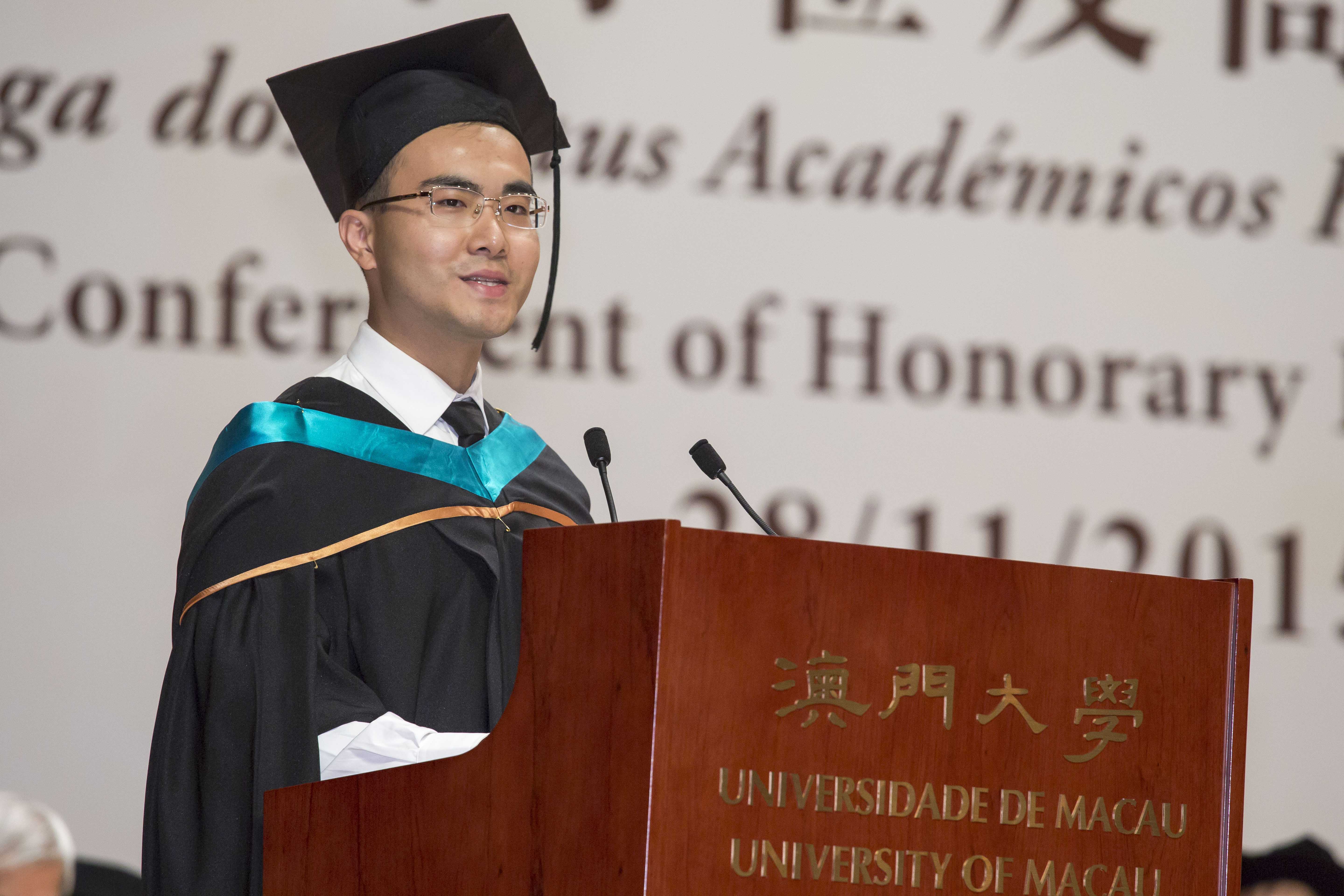 澳大畢業生代表郭宇麒致辭時首先感謝政府,給了他們一個美麗的新校園;同時他感謝澳大的領導,讓學生在碩士課程有機會參與研究,走進研究實驗室與科學研究員接觸,體驗發現的樂趣;他認為這是一些同學沒有接受其他很好的學校錄取的原因;他還感謝導師的教導和關心愛護。郭宇麒將繼續留在澳大深造,攻讀博士學位,他最後一句說:“我絕對是‘澳門製造’,我為此感到自豪。",贏得全場熱烈掌聲。