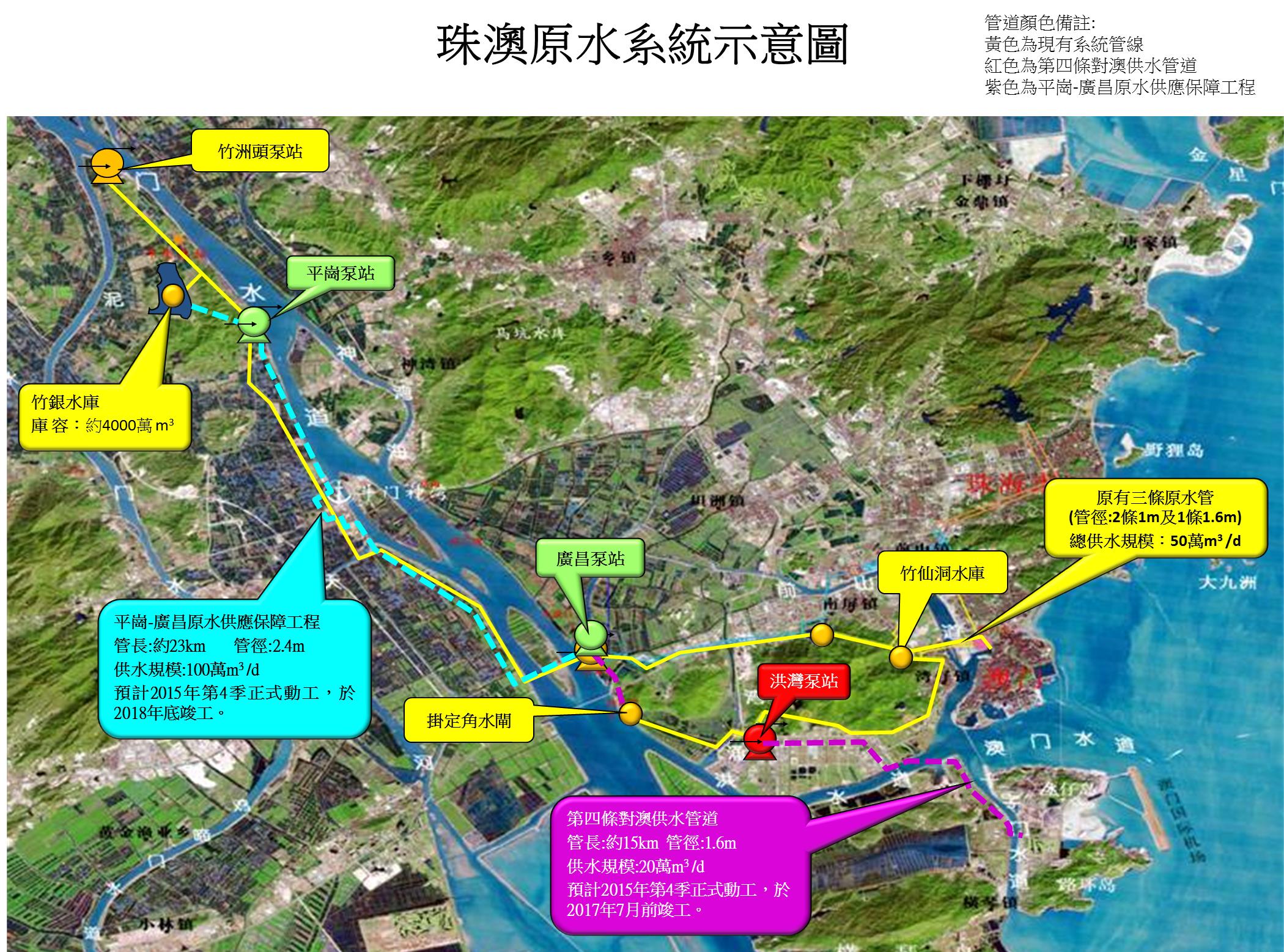 現時使用中的三條珠海對澳供水管道均是從澳門北端進入本澳,使本澳的公共供水形成自北向南的輸送模式,輸水管線較長且經過跨海大橋,管線走向單一。隨著路氹城區高速發展,用水量快速增長,現存基建設施對離島區的供水能力將於未來幾年內達到飽和。粵澳合作建設的第四條對澳供水管道,將會由珠海橫琴直接進入路氹城區,不但可有效應對未來的發展需要,確保澳門供水的可持續發展,同時也能優化供澳原水管線佈局,提高抗風險能力,進一步保障澳門供水安全及可持續發展。