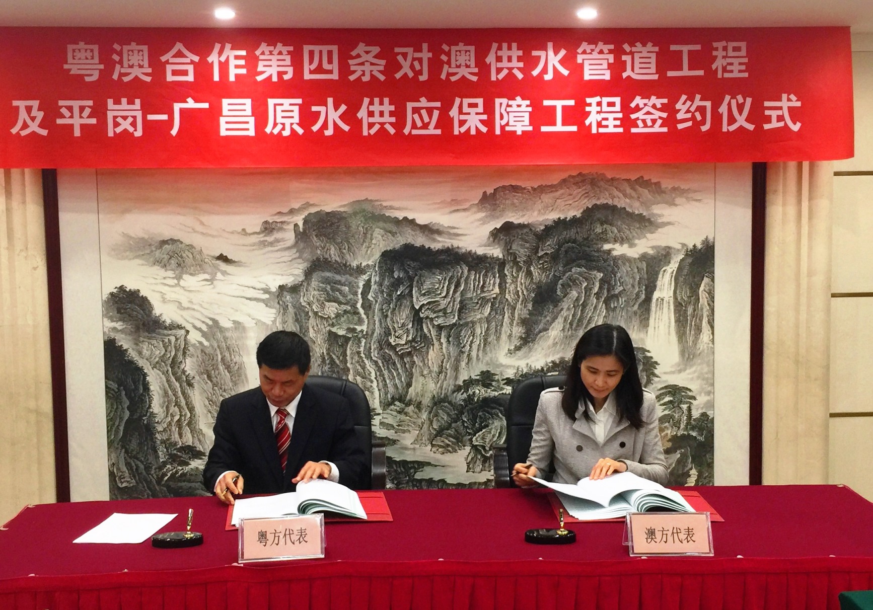 澳方代表團今早前往珠海,得到廣東省水利廳以及珠海市人民政府的盛情接待。簽署儀式在今早11時30分舉行,廣東省水利廳林旭鈿廳長以及澳門海事及水務局黃穗文局長代表粵澳雙方簽署了《協議》。《協議》的簽署標誌著現時珠海對澳供水管道走向單一以及未來澳門用水需求增加的問題將得到解決,設施投入運作後不但能有效應對目前的發展需要,同時也能優化供澳原水管線佈局,對澳門供水安全起到長治久安之效,確保澳門的可持續發展。