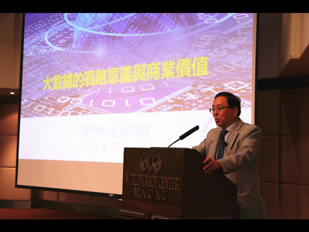講座由澳門大學副校長(學術)倪明選講座教授主講。倪教授曾擔任國家973計劃,無線傳感網絡項目首席科學家。在加入澳大之前,為香港科技大學計算機科學與工程系講座教授,並擔任校長特別助理及香港科大霍英東研究院院長,也曾任美國國家科學基金會項目主任。倪教授表示,大數據時代開啟了全球範圍內從信息時代走向數據時代的思維變革和技術創新,如何通過數據分析、挖掘及應用,將數據轉化為具有戰略意義的核心競爭力是世界各國共同的發展目標和願景。