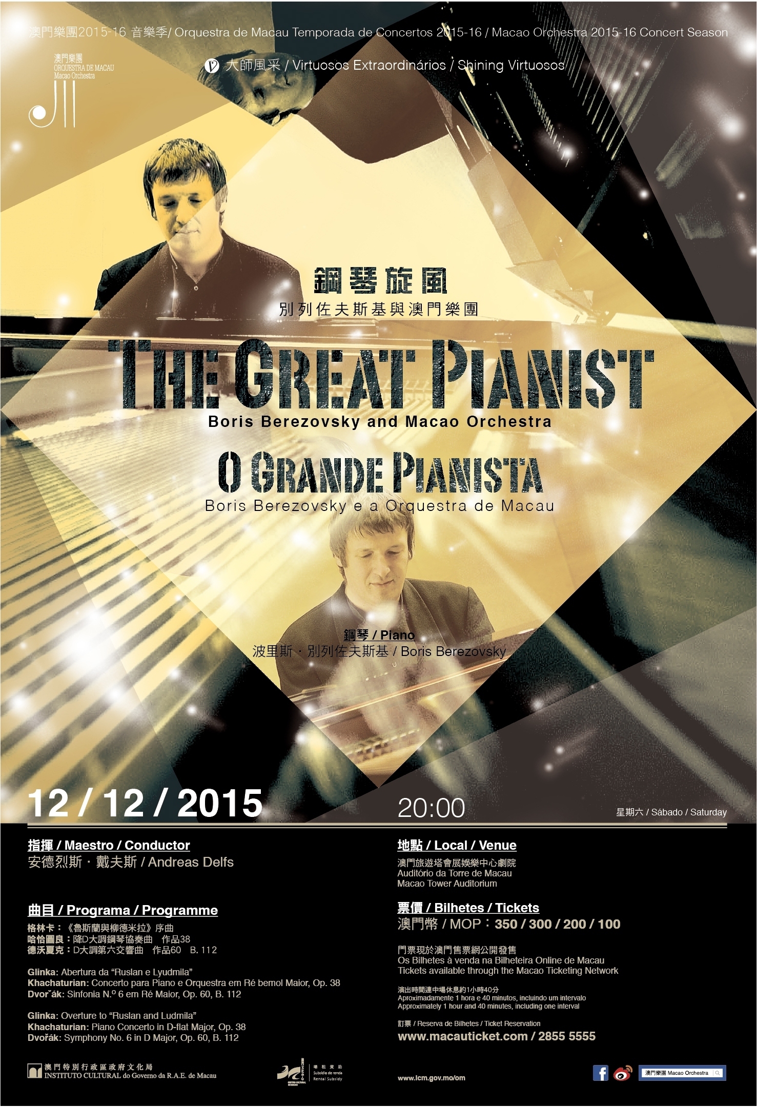 文化局澳門樂團邀請俄羅斯鋼琴學派傑出代表別列波里斯.佐夫斯基(Boris Berezovsky),於十二月十一及十二日(星期五及六)晚上八時,分別假廣州大劇院及澳門旅遊塔會展娛樂中心劇院舉行《鋼琴旋風—別列佐夫斯基與澳門樂團》音樂會。兩場音樂會廣受兩地樂迷歡迎,現只餘澳門場次少量門票。
