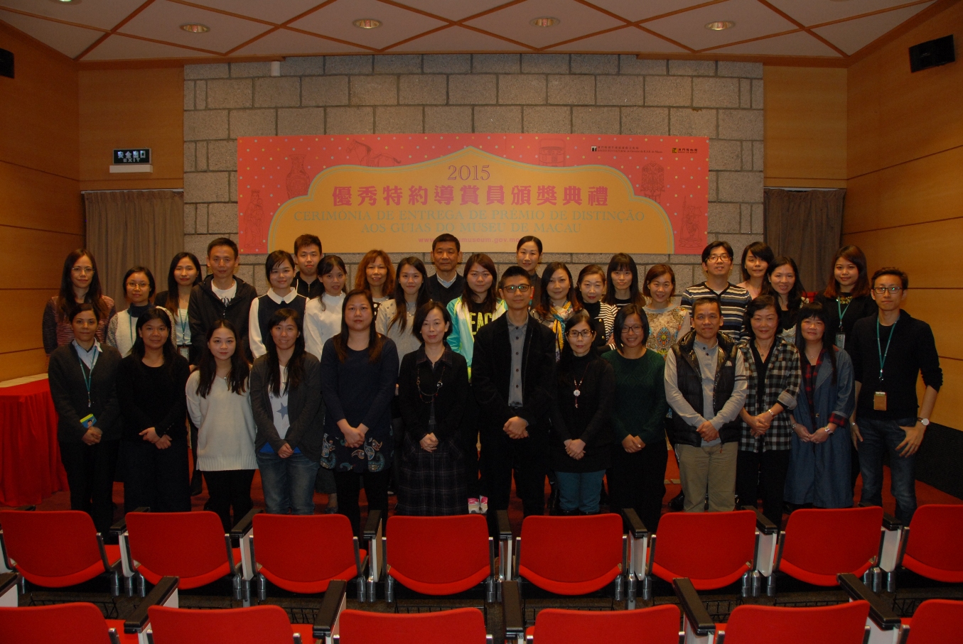 文化局澳門博物館於日前(十二月十一日)舉辦“二零一五年度優秀特約導賞員頒獎典禮”,向本年度為澳門博物館提供社會服務的優秀特約導賞員頒發獎項,藉此鼓勵長期為公眾和學校教育作出卓越貢獻的特約導賞員。