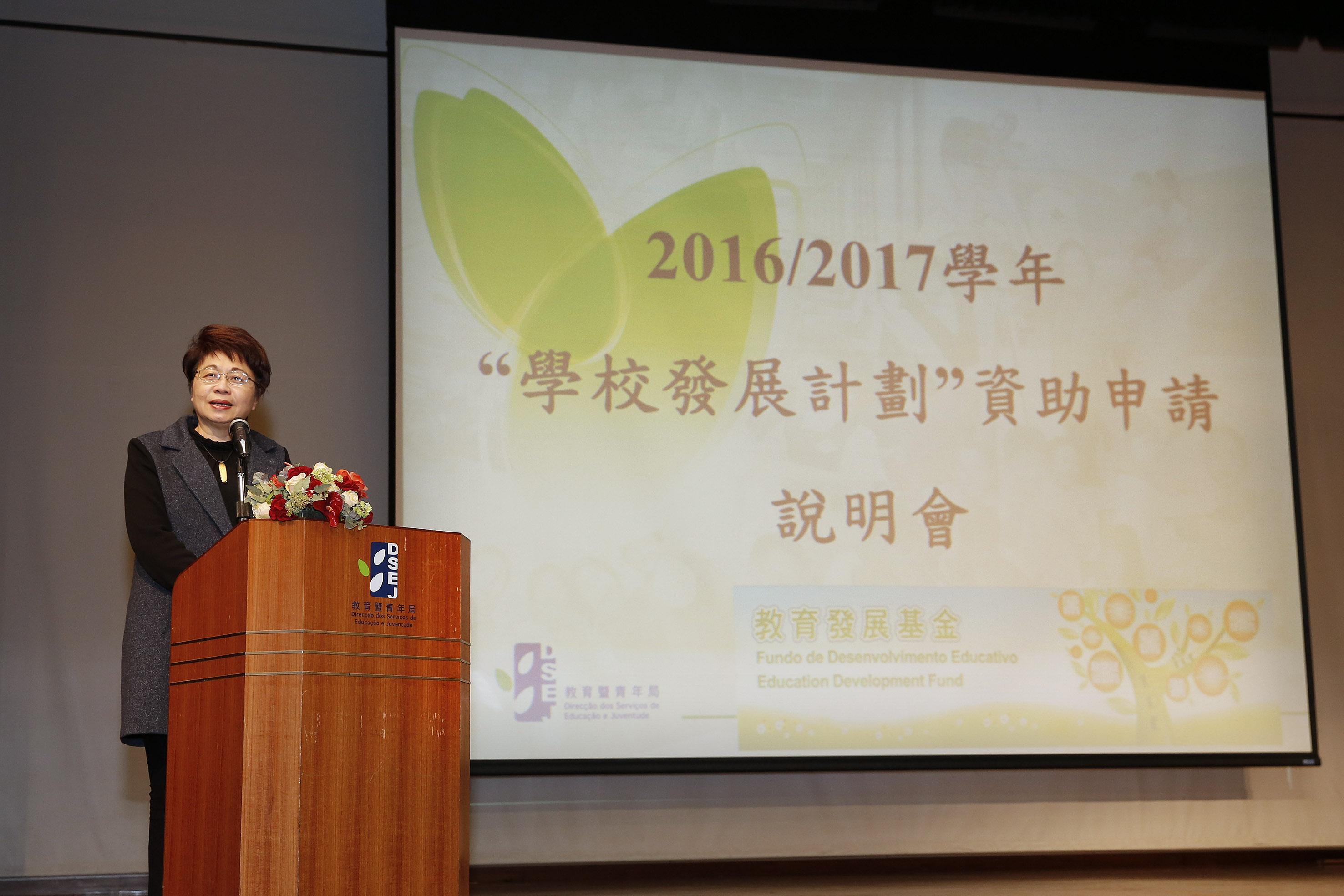 教青局教育廳廳長梁慧琪、學校體育暨課餘活動事務處余漢生首席高級技術員、教育研究暨資源廳廳長黃健武分別介紹2016/2017學年“學校發展計劃”資助申請總章及新調整方案、“學校課外活動資助計劃”、“校舍工程與購置設備招標指引”、“課程發展先導計劃”、“資訊科技教育”、電子化申請等。