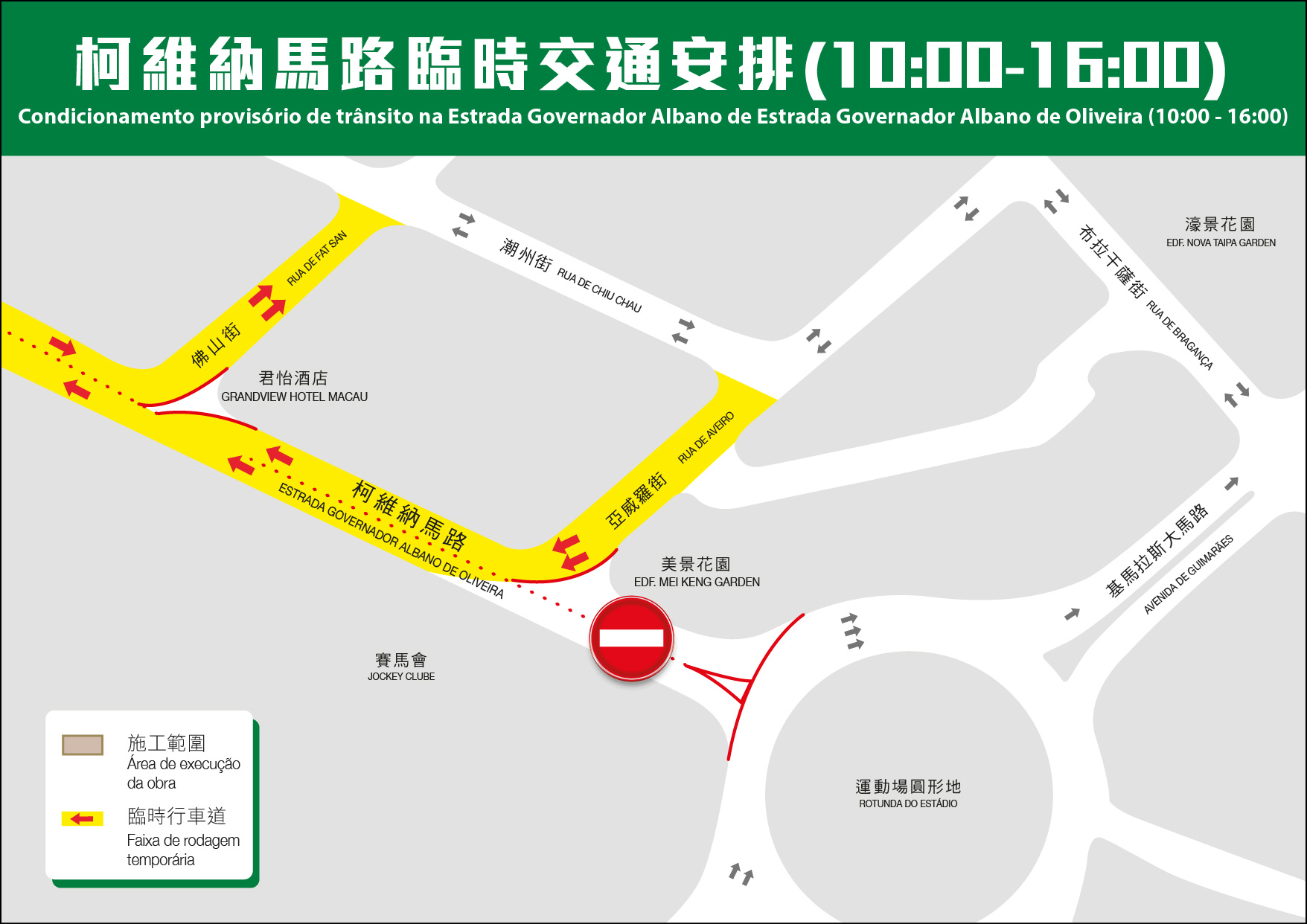 輕軌氹仔線於柯維納馬路一帶正進行大規模吊裝工作,為確保施工安全及主幹道交通流量,周二(12日)起,每日上午10時至下午4時,介乎氹仔亞威羅街與運動場圓形地的一段柯維納馬路實施封閉交通,介乎柯維納馬路與潮州街的一段亞威羅街只可駛往柯維納馬路,而介乎柯維納馬路與潮州街的一段佛山街則只可駛往潮州街方向。其間,經運動場圓形地往賽馬會方向的車輛可改經基馬拉斯大馬路轉入布拉干薩街及亞威羅街行駛;而由南新花園往運動場圓形地方向的車輛則須轉入佛山街行駛,為期約11日。