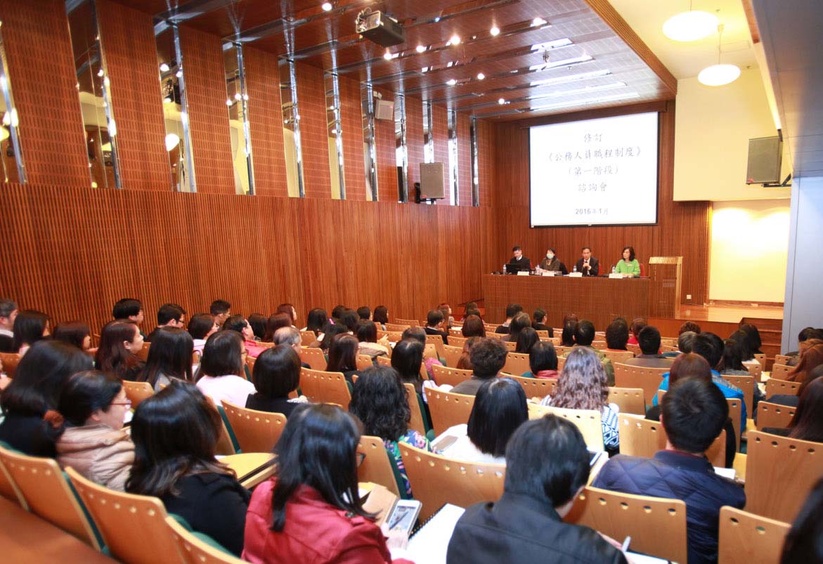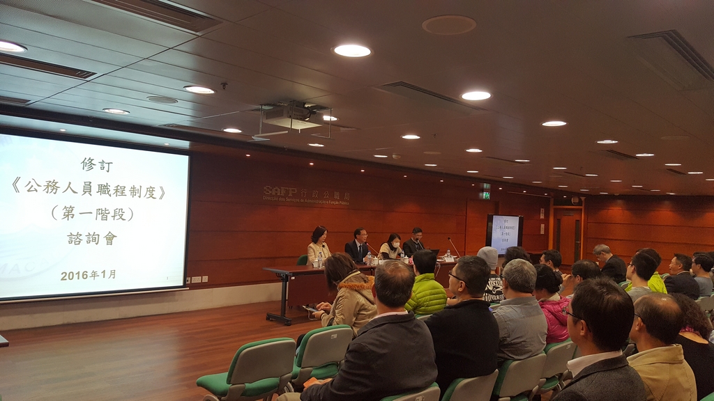 為收集首階段建議的意見,行政公職局於去年12月中至本年2月中進行為期2個月的諮詢,對象包括公共部門、公務人員和公務人員團體等。同時,於日前分別舉行3場諮詢講解會,由行政公職局高炳坤局長、馮若儀副局長、公務人員規劃及招聘廳曾慶彬廳長、及公務人員培訓中心陳玉玲主任就諮詢內容進行介紹並聽取意見。