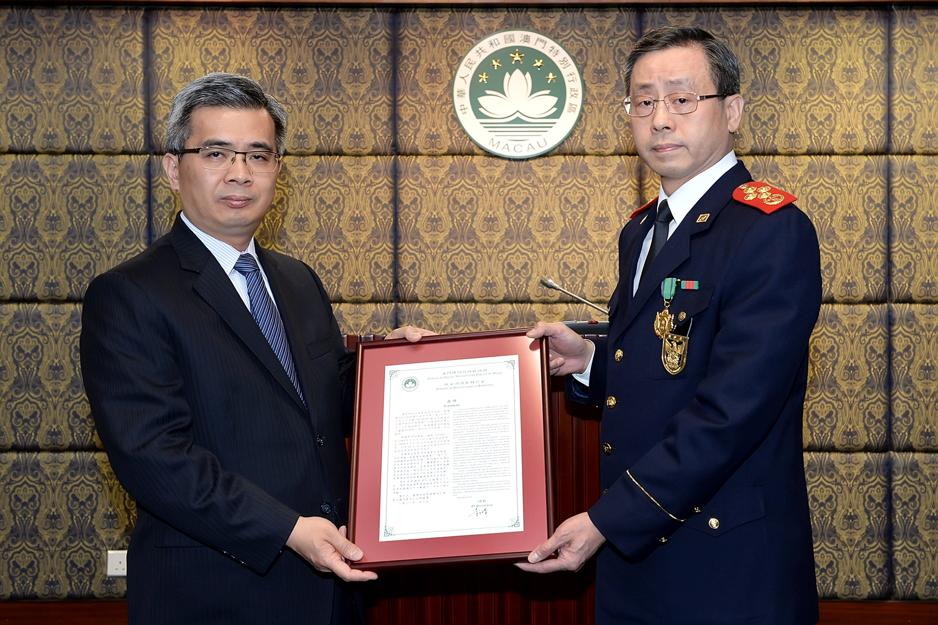 儀式於2016年1月15日上午11時在保安司司長臨時辦公室舉行。出席嘉獎儀式還包括警察總局馬耀權局長、保安部隊及部門所有局長及消防局多位領導主管人員。