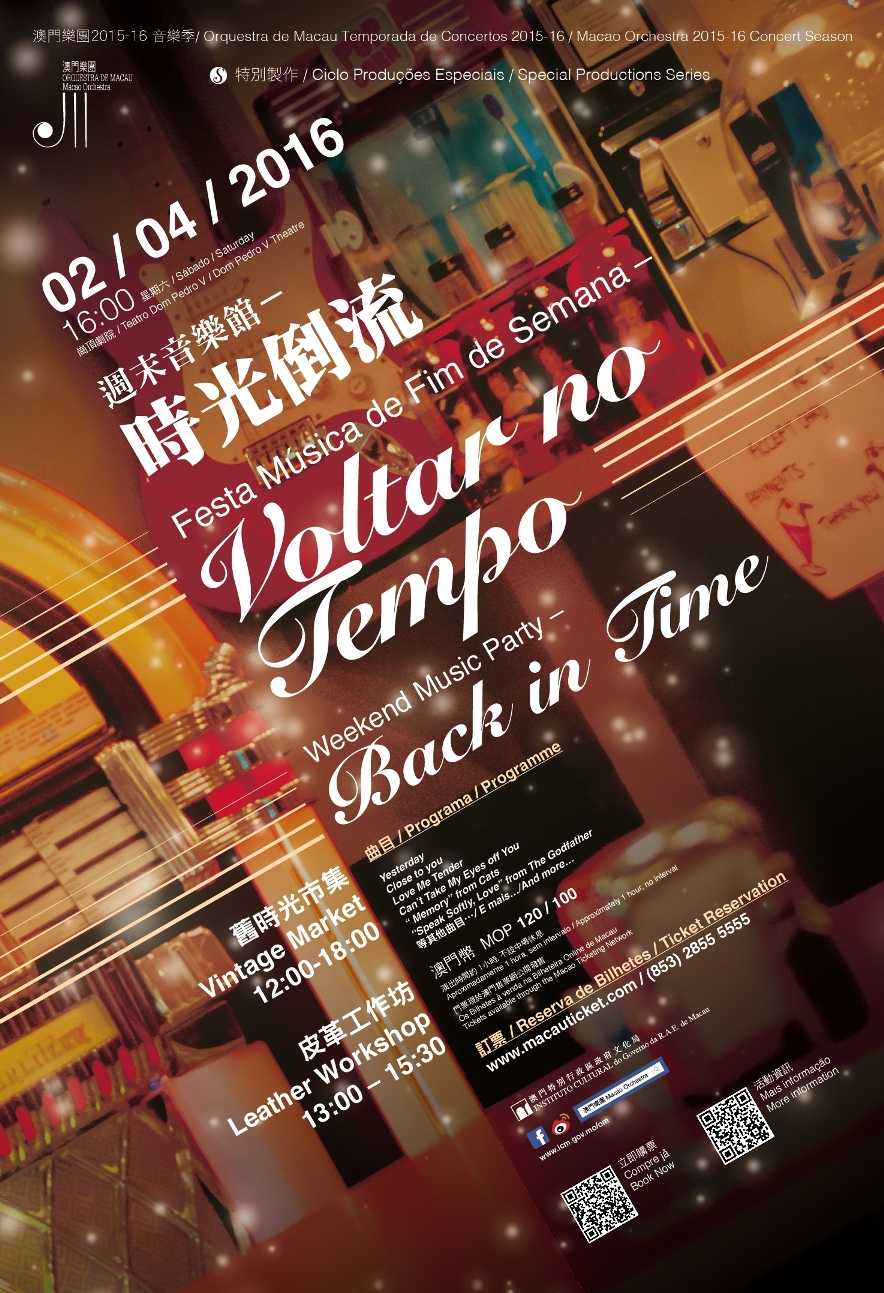 《週末音樂館-時光倒流》音樂會票價一百二十及一百澳門元,購票熱線二八五五五五五五。詳情及節目查詢可瀏覽澳門樂團網頁www.icm.gov.mo/om。