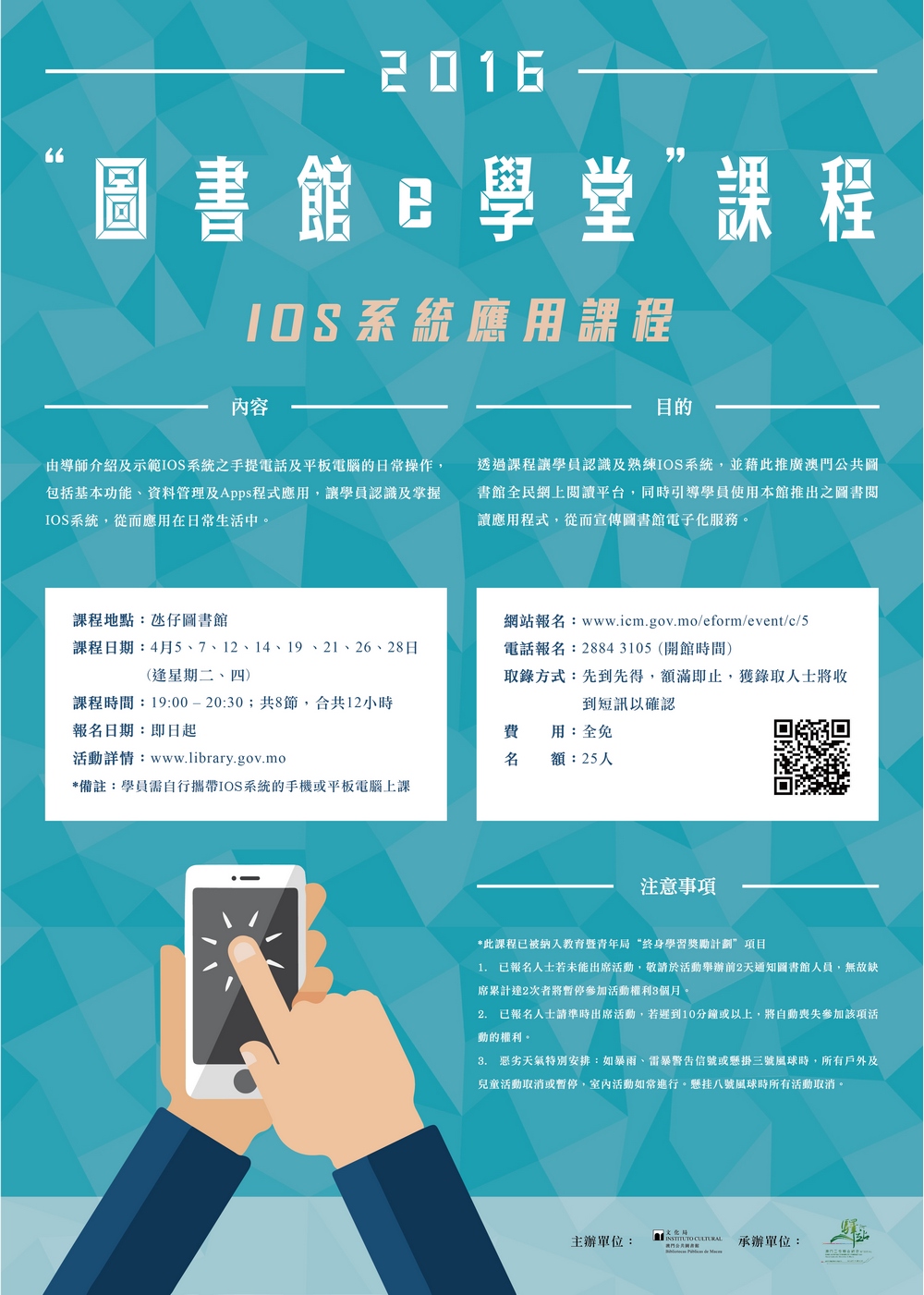 “IOS系統應用課程”主要由導師示範及介紹IOS系統的手提電話及平板電腦的應用操作,包括IOS系統基本功能介紹、設定的方法、社交平台等應用程式的使用等等,從而應用在日常生活中。課程四月份逢星期二、四於氹仔圖書館舉辦,上課時間為晚上七時至八時三十分,名額有限,額滿截止,獲錄取人士將收到短訊確認。即日起接受報名,有興趣之市民可於文化局網頁www.icm.gov.mo/eform/event作網上報名,亦可於開館時間致電二八八四三一零五電話報名及查詢,活動詳情請瀏覽www.library.gov.mo。
