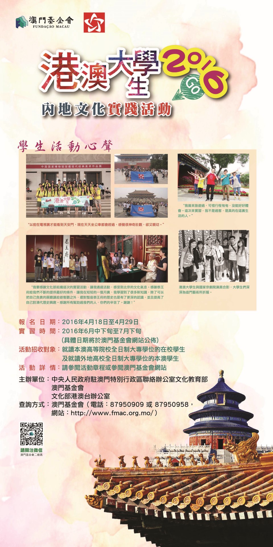 為協助本澳在校大學生及在外地大專院校就讀的本澳學生到內地文博機構進行工作實踐、汲取工作經驗和擴展視野,幫助在校學生將學習知識與實際工作相互印證,中聯辦文化教育部、澳門基金會及文化部港澳台辦聯合舉辦“2016年港澳大學生內地文化實踐活動”。此次活動的招收對象是就讀本澳高等院校全日制大專學位的在校學生及就讀外地高校全日制大專學位的本澳學生,活動報名時間從2016年4月18日至4月29日。
