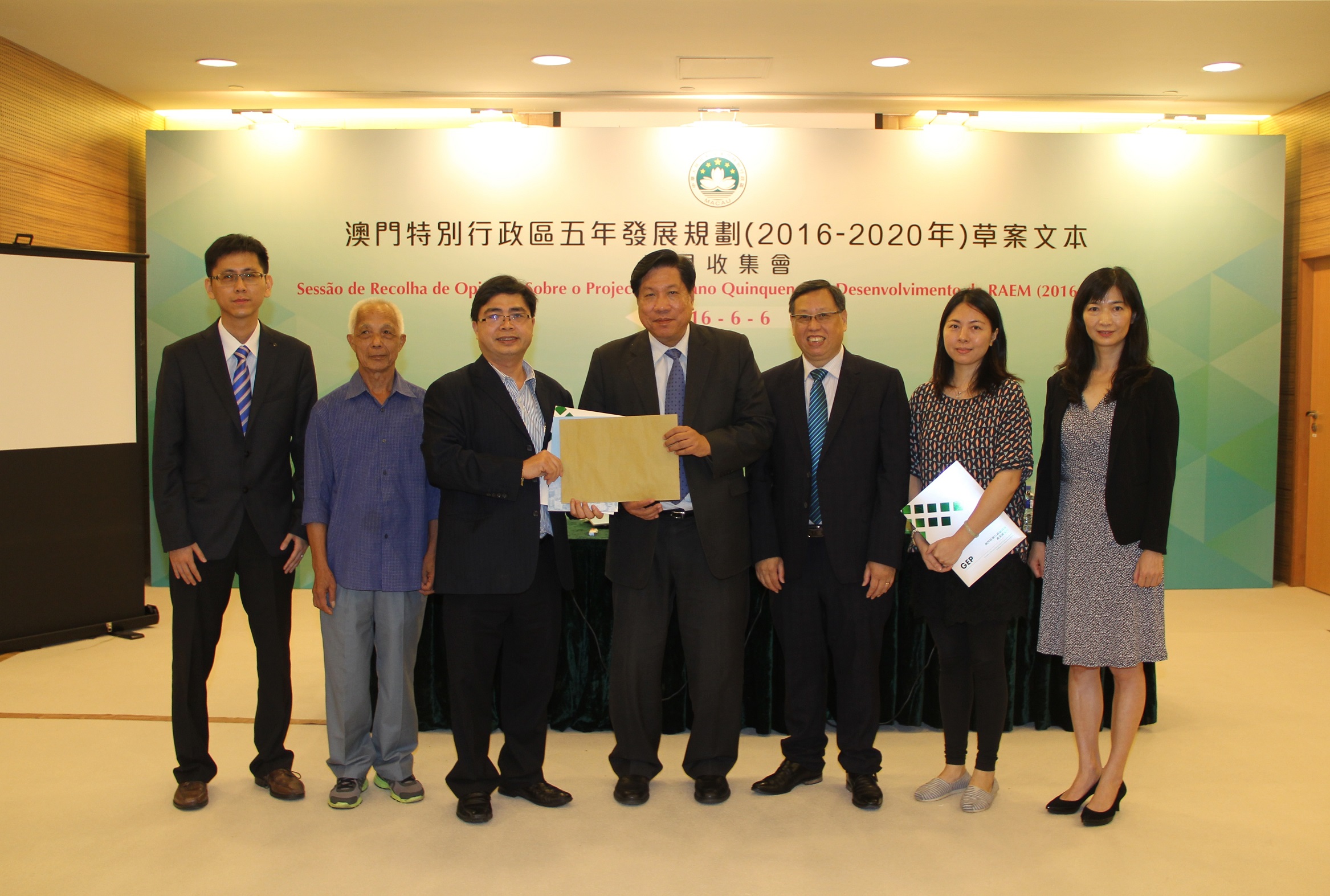 《澳門特區五年發展規劃(2016-2020年)草案文本》於4月26日公佈並展開為期兩個月的意見收集工作。專責本次意見收集工作的政策研究室今日(6月6日)上午於政策研究室舉行了地產及鄉誼社團專場的意見收集會。政策研究室主任劉本立、職務主管高展明及研究員連信森出席了意見收集會,並聽取了與會人士的意見。