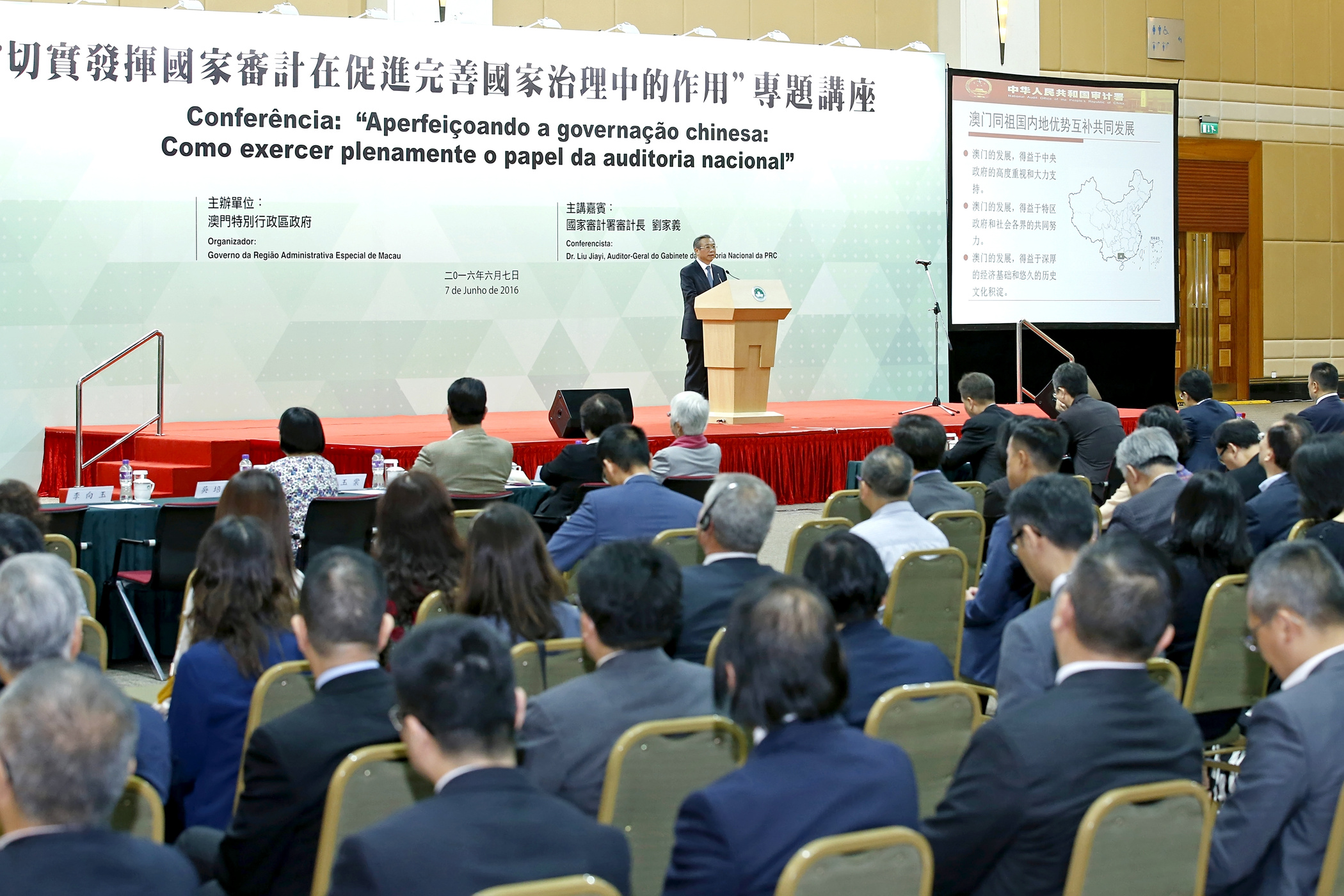 6月7日,國家審計署審計長、世界審計組織主席劉家義應澳門特區政府邀請,假澳門東亞運動會體育館國際會議中心發表“切實發揮國家審計在促進完善國家治理中的作用”專題演講,是次講座由澳門審計長何永安主持,行政長官崔世安、全國政協副主席何厚鏵、澳門特區政府的主要官員、行政會委員、局級官員、全國人大代表、全國政協委員和第四屆行政長官選舉委員會委員等300多人出席講座。