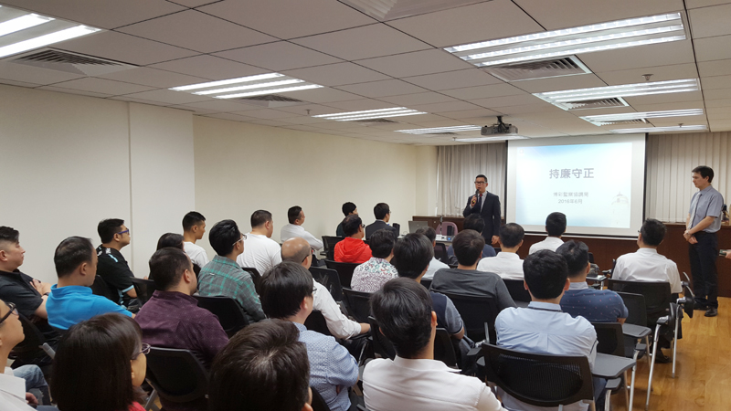 博彩監察協調局一直高度重視且嚴格要求全體人員盡忠職守及廉潔奉公,而為鞏固和提升人員的廉政意識,特邀廉政公署代表於5月18日及6月1日為局方逾一百二十多名督察舉行《持廉守正》專題講座。