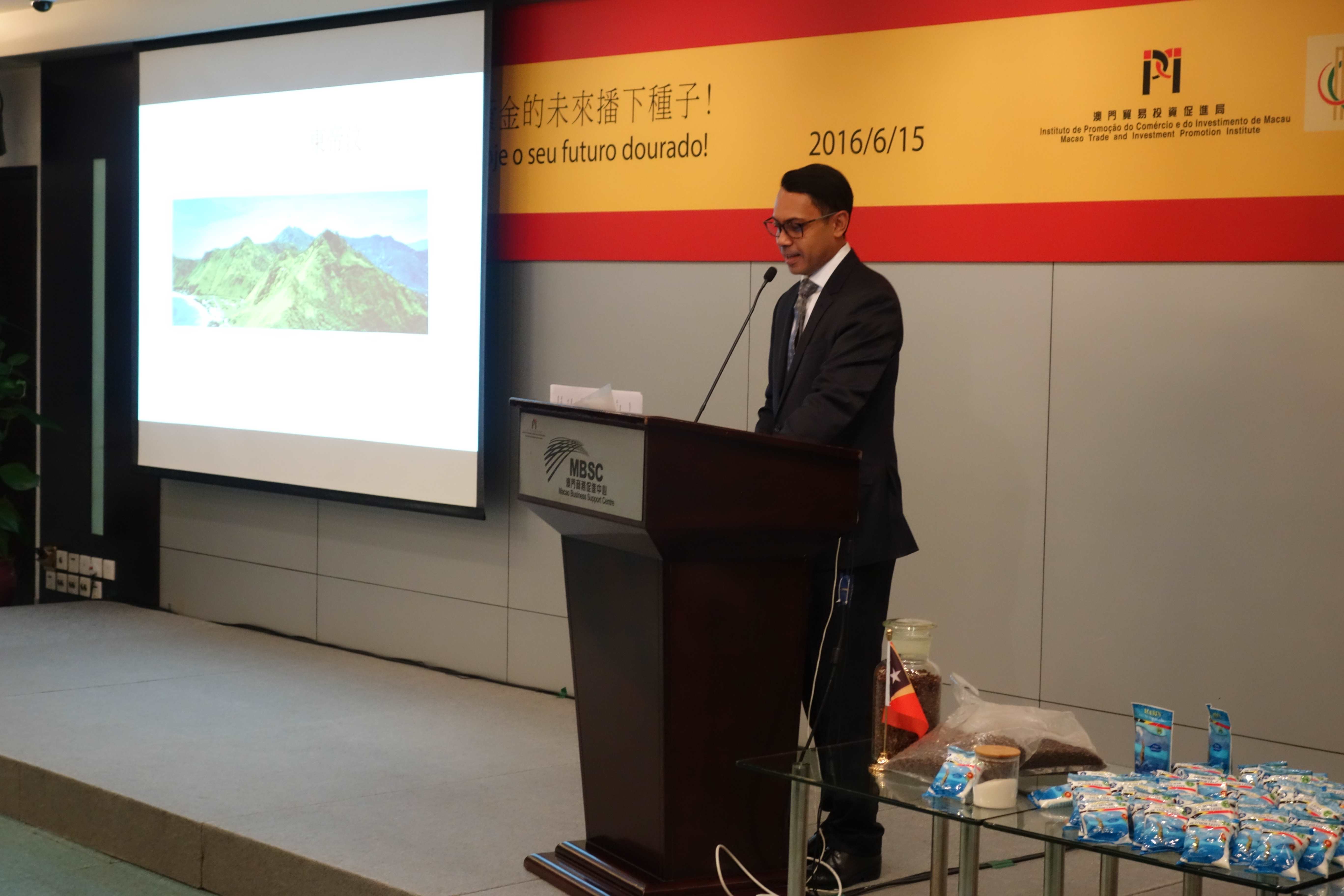 為彰顯澳門作為中國與葡語國家商貿合作服務平台功能,深化區域經濟合作及協助澳門中小企業及鄰近地區企業更了解葡語國家市場,澳門貿易投資促進局與中國 – 葡語國家經貿合作論壇(澳門)常設秘書處今(15)日在澳門商務促進中心合辦“東帝汶 – 今天為你黃金的未來播下種子!”推介會。活動吸引了超過50位於本地從事貿易、地產、律師事務及物流等經貿機構代表參加。