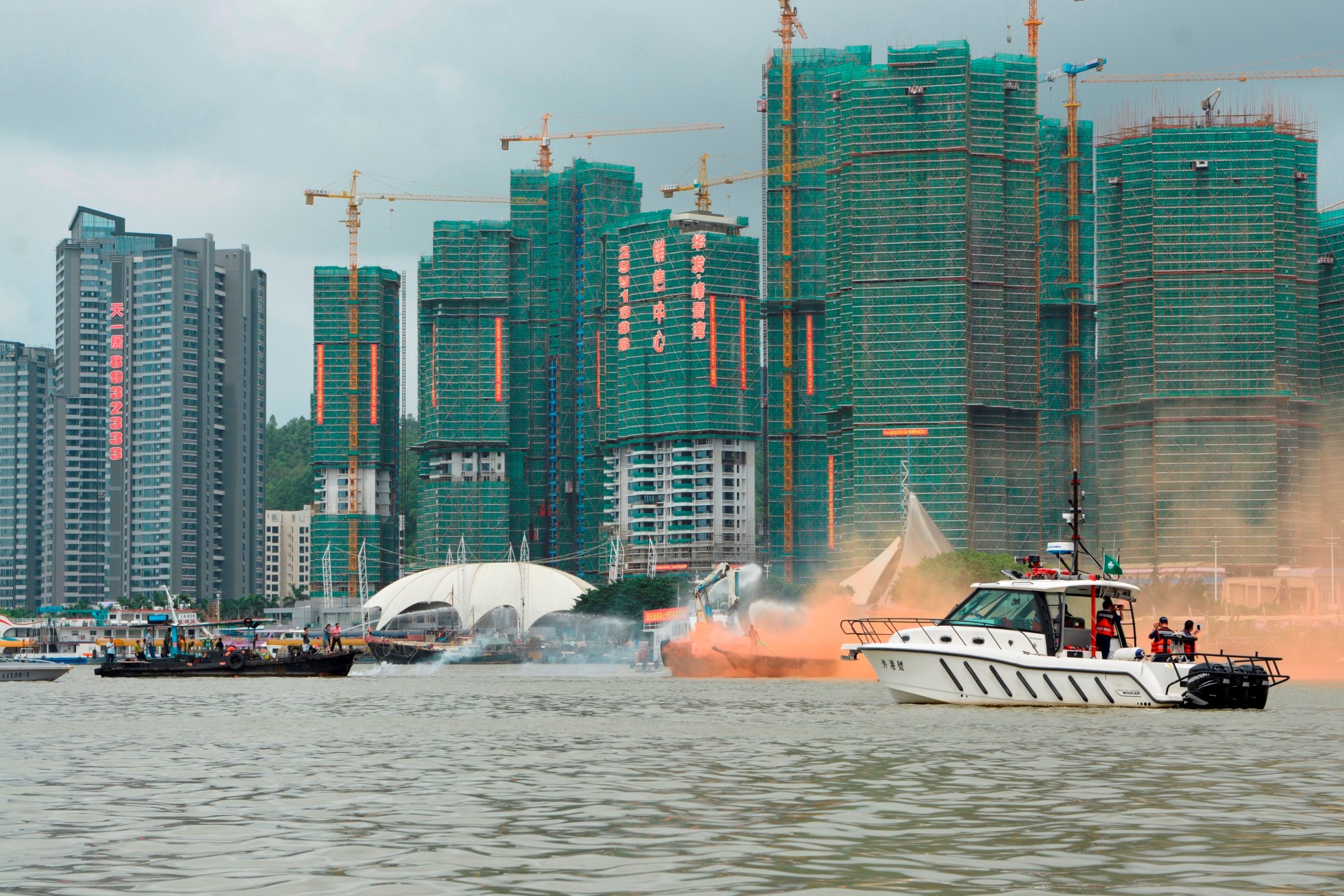 廣東省漁政總隊灣仔大隊今日(16)在珠海灣仔漁港舉行消防應急演練,以及消防救生設備使用及安全宣傳活動,海事及水務局派出了船隻“外港號”到灣仔漁港參與漁船應急疏散演練等環節,同時亦派出船隻“港巡一號”駐守南舢舨碼頭和北舢舨碼頭,維持現場的海上交通秩序。