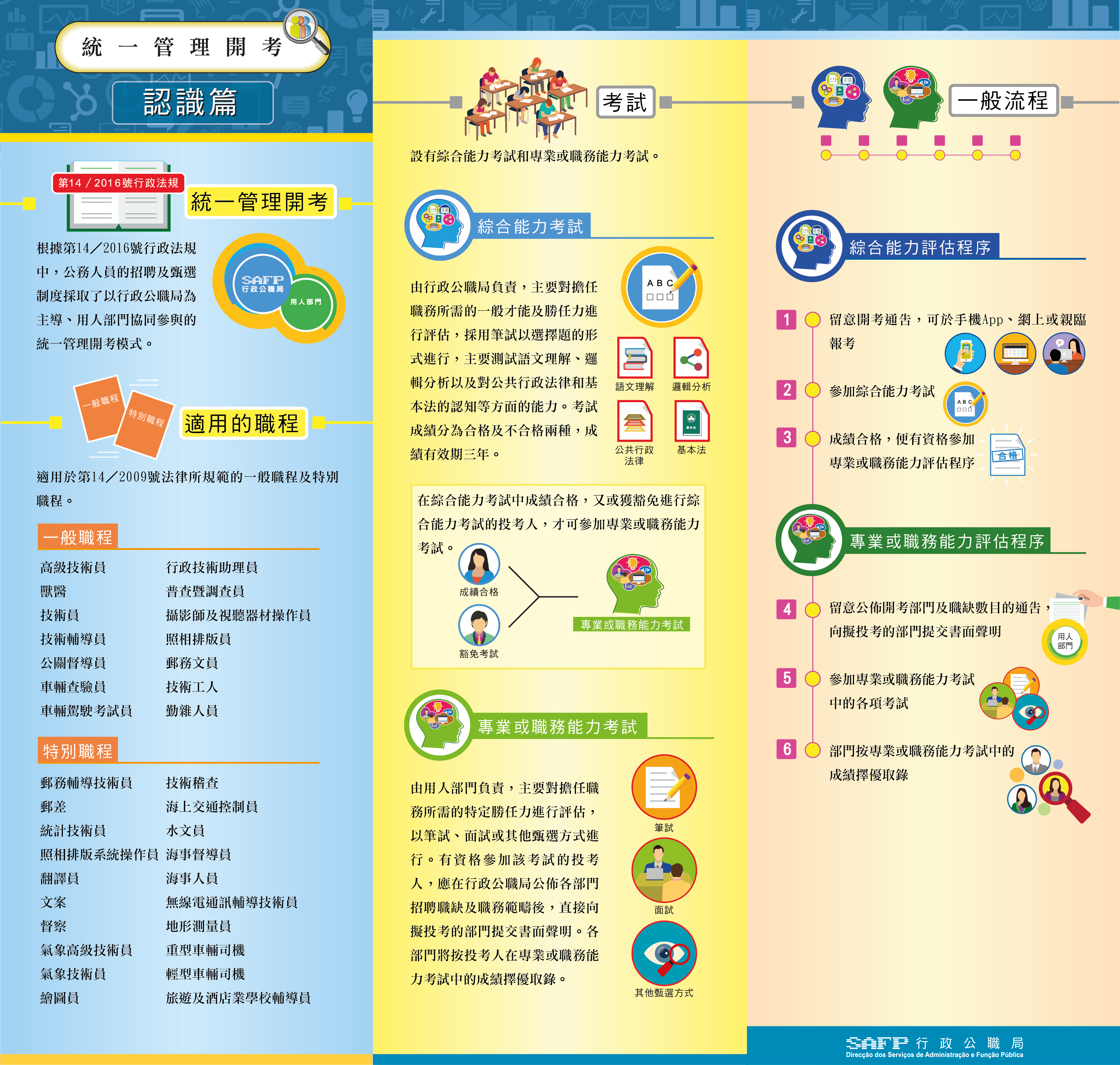 統一招聘分為“綜合能力考試”,以及“專業或職務能力考試”,適用對象包括第14/2009號法律《公務人員職程制度》規範的職程,涵蓋14個一般職程及20個特別職程,計劃於今年內就高級技術員、技術輔助人員及工人這三個人員組別舉辦“綜合能力考試”。