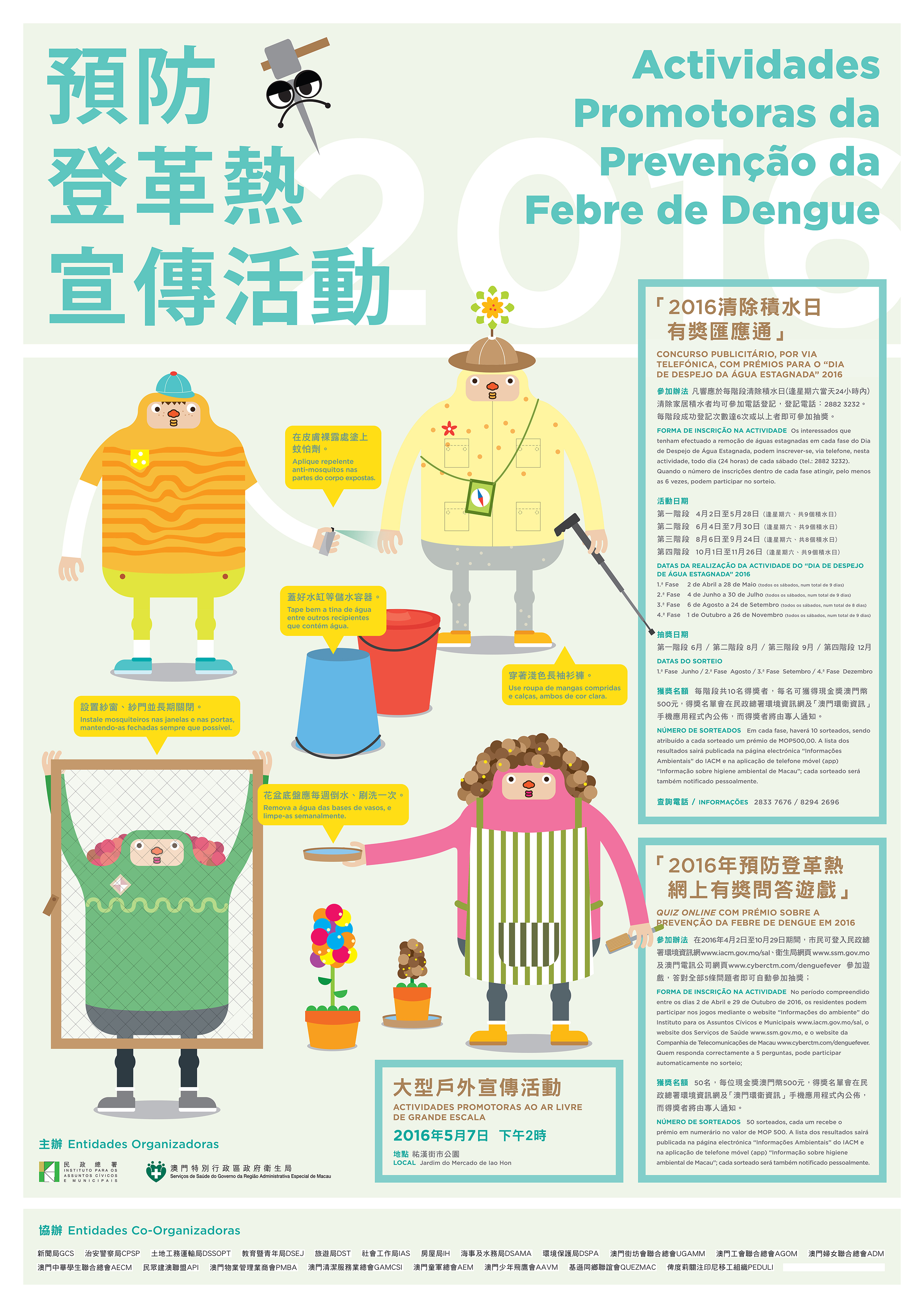 工作小組表示,為鼓勵市民定期清理家居的積水容器,小組於本年4月2日至11月26日期間舉辦 “清除積水日有獎匯應通”活動,以提醒市民防範登革熱。活動分為4個階段進行,第1階段為4月2日至5月28日、第2階段為6月4日至7月30日、第3階段為8月6日至9月24日、第4階段為10月1日至11月26日,本澳市民於每階段逢星期六清除家居積水工作後,即可在當天內致電2882 3232作電話登記,每階段成功登記次數達6次或以上者便可參加抽獎。抽獎分別於6月、8月、9月及12月舉行,每階段共10名得獎者,每位可獲得現金獎500澳門元。