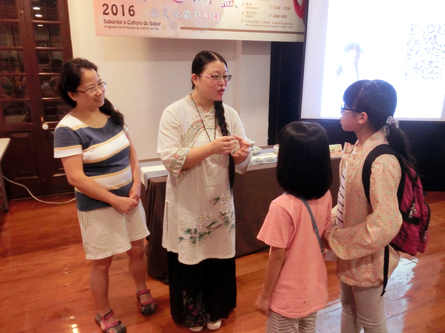 是次 “親子茶藝工作坊”由澳門茶藝協會的資深茶藝導師潘惠芬以輕鬆活潑的方式介紹中國茶葉種類、製造方法、特性和茶具使用方法,藉此啓發兒童和家長的感官,引導參加者運用視覺、嗅覺、味覺和心靈來欣賞茶湯之色、香、味、形。每位參加者均可親身體驗泡茶的樂趣,品嚐自家沖泡的茶,同時讓兒童透過認識泡茶奉茶的過程學習親孝之道,增進親子關係。活動對象為十二個家庭,每個家庭最多四人參加,而每位兒童須由一名家長陪同。