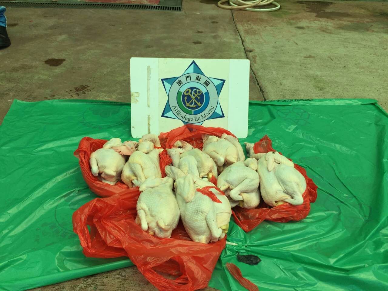 海關行動管理廳聯同民署食品安全中心執法人員,今日(23日)早上在澳門北區一帶巡查時,查獲一宗非法攜帶未經檢疫禽鳥的案件,一名剛從內地回澳的本澳女子,被發現身上夾帶8隻已屠宰之雞隻,海關將該名女子帶到海關總部協助調查,並以行政違法作出檢控。