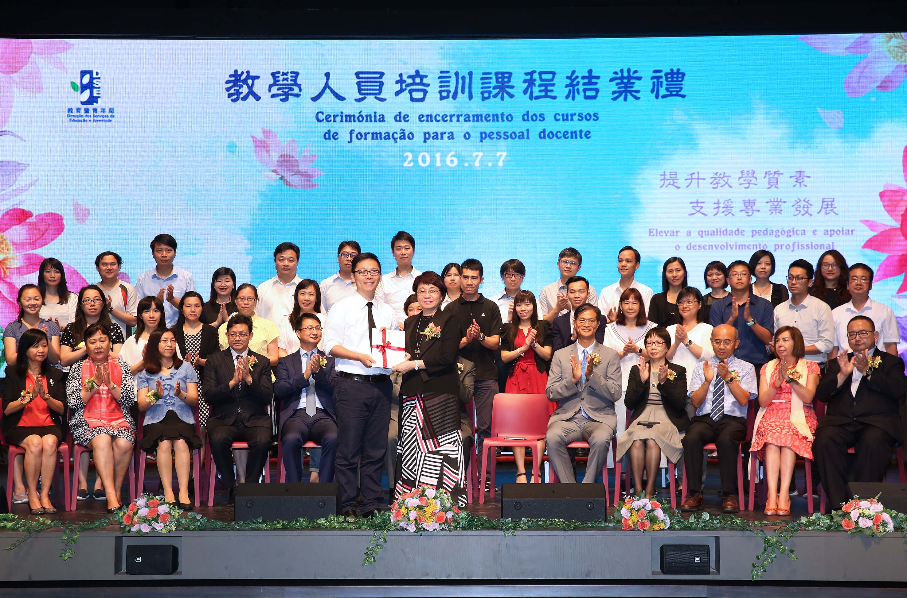 為了與教學人員共同分享完成培訓的碩果與喜悅,同時藉此鼓勵教學人員持續進修,為教育質素不斷的提升作出貢獻,教青局於7月7日下午在聖保祿學校禮堂隆重舉行了“2015/2016學年教學人員培訓課程結業禮”。 社會文化司司長譚俊榮、社會文化司司長辦公室主任葉炳權、教青局局長梁勵、中央人民政府駐澳門特別行政區聯絡辦公室文化教育部副部長浦海龍、社會文化司司長辦公室顧問惠程勇、教青局副局長老柏生和郭小麗、教育部港澳台事務辦公室主任科員張君、澳門大學教育學院院長范息濤、澳門理工學院語言暨翻譯高等學校代校長崔明芬、澳門大學人文學院葡文系主任Maria Fernanda Gil Costa、澳門中華教育會會長何少金、澳門天主教學校聯會會長周伯輝,以及培訓機構的代表及導師、各校校長及參加培訓課程的600多名教學人員出席了典禮。