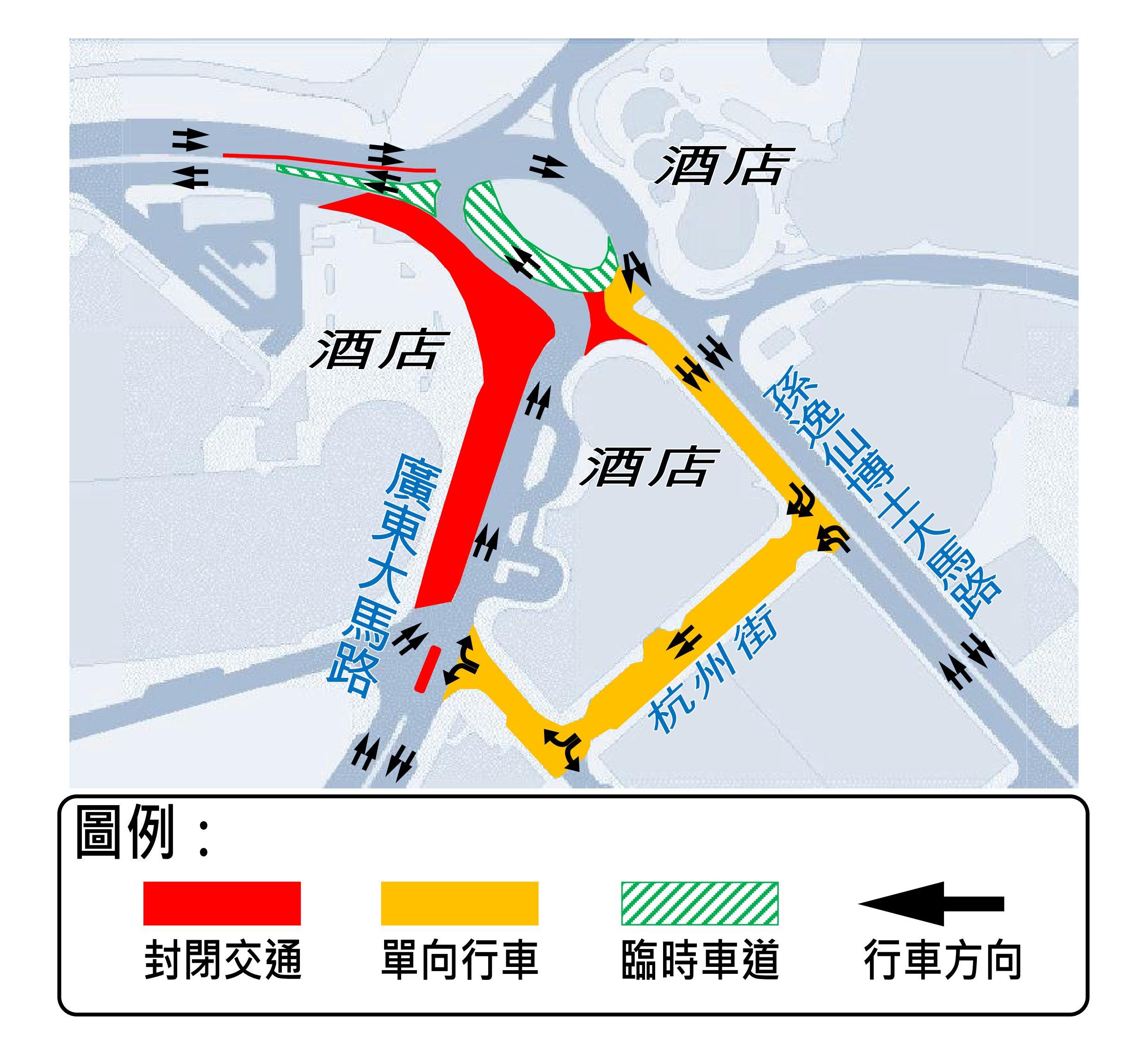 配合施工安排,首階段工程本月16日(周六)展開,並臨時封閉史伯泰海軍將軍馬路與廣東大馬路交界路段;史伯泰海軍將軍馬路近宋玉生博士圓形地的路段實施雙向行車;而實施單向行車的路段包括:孫逸仙博士大馬路(車輛須往杭州街方向行駛)、杭州街(車輛須往南京街方向行駛)、南京街(車輛須往往廣東大馬路方向行駛)、廣東大馬路(車輛須往往宋玉生博士圓形地方向行駛)。與此同時,廣東大馬路及杭州街部分車輛咪錶泊位及電單車泊位暫停使用。