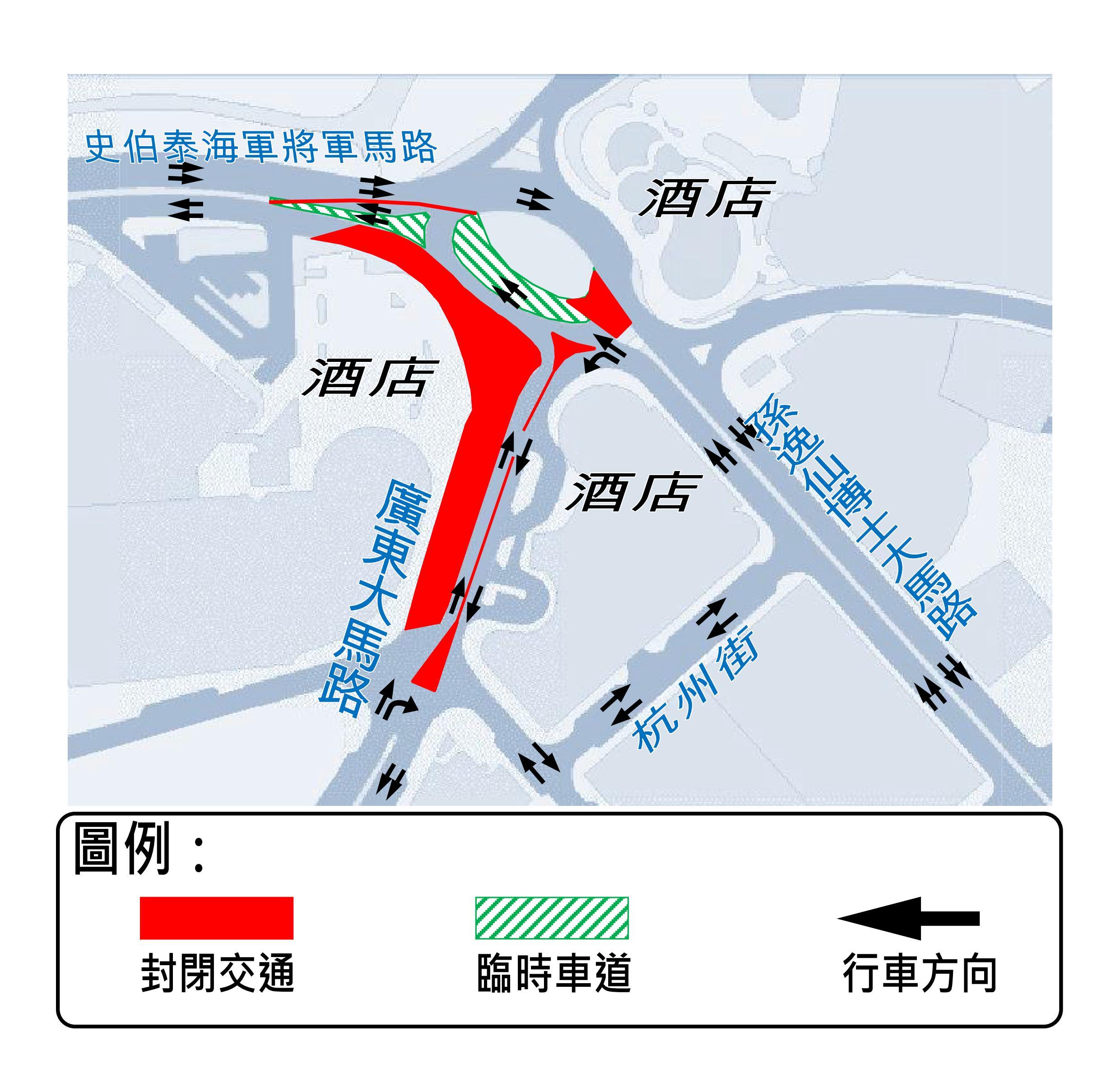 經調整後,本月23日(周六) 上午10時起,史伯泰海軍將軍馬路與廣東大馬路交界路段、宋玉生博士圓形地連接史伯泰海軍將軍馬路及孫逸仙博士大馬路之交界路段實施封閉;介乎南京街與宋玉生博士圓形地之間的一段廣東大馬路(往宋玉生博士圓形地方向)實施雙向行車;而臨時實施單向行車的孫逸仙博士大馬路、杭州街、南京街及廣東大馬路會恢復雙向交通安排。史伯泰海軍將軍馬路近宋玉生博士圓形地的路段則實施有限通車。與此同時,廣東大馬路及杭州街之車輛咪錶泊位及電單車泊位繼續暫停使用,為期約60日。