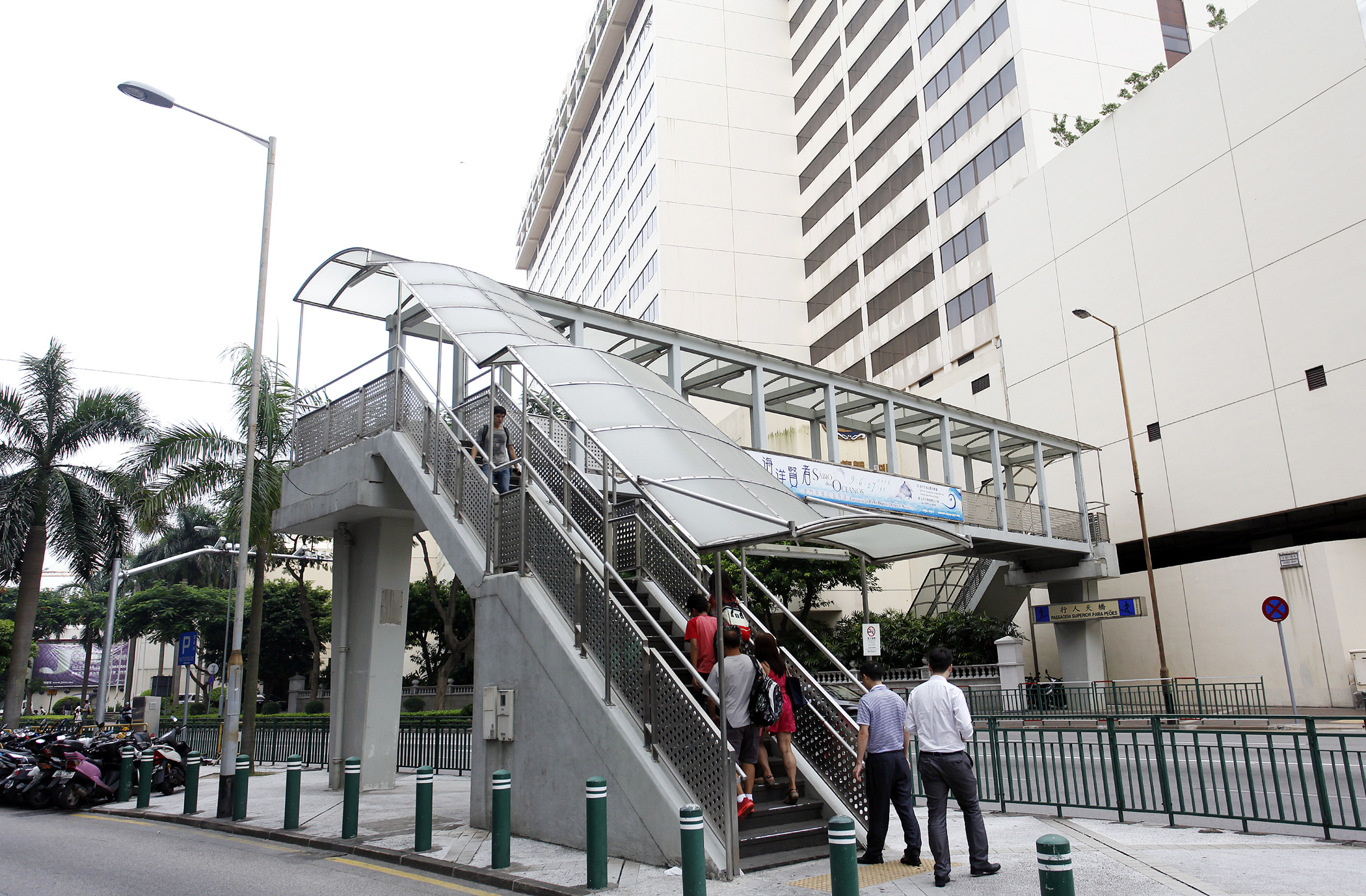 現時位於友誼大馬路南方大廈旁行人天橋,是往來新口岸區及皇朝區的主要行人過路設施之一,為方便市民,特別是長者及有需要人士使用,天橋兩端將加設升降機,升降機井塔及樓梯使用鋼結構、升降機出入口及樓梯採用防滑材料及安裝扶手、設有發聲提示裝置及凸字按鈕等;外觀造型方面,電梯井道在平行友誼大馬路的方向採用鋁塑板飾面,望向賽車跑道方向則採用鋼化玻璃,協調周邊環境景觀。
