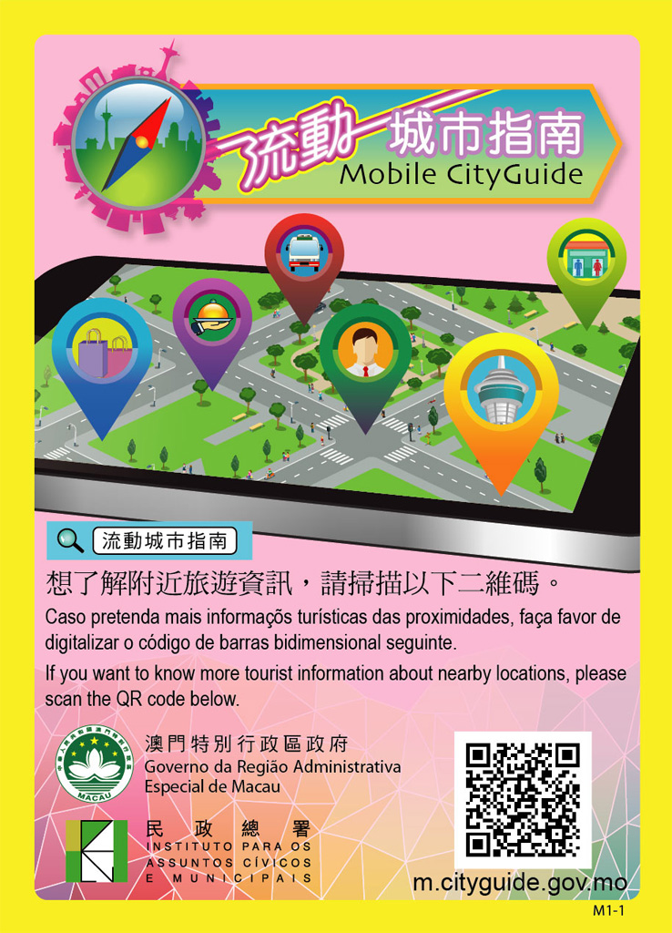 為推廣民政總署開發的“流動城市指南"手機網站,民署在澳門及氹仔各區約六十枝古典柱式指示牌上設置了介紹“流動城市指南"的不銹鋼片,方便本澳居民及旅客登入上述手機網站,即時獲取周邊區域的最新旅遊及生活資訊。