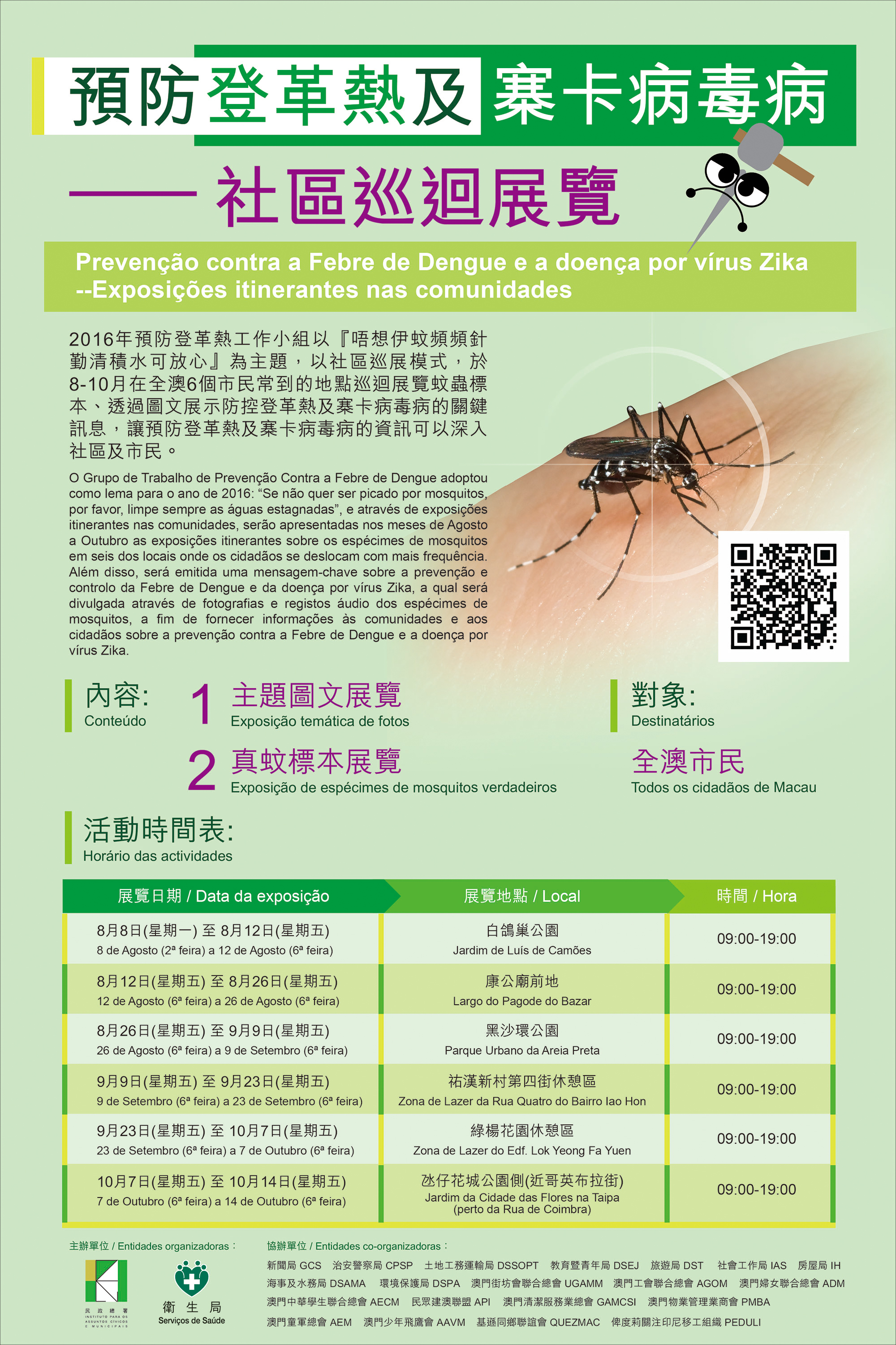 預防登革熱及寨卡病毒病社區巡迴展覽先後於白鴿巢公園(8月8日至8月12日)、康公廟前地(8月12日至8月26日)、黑沙環公園(8月26日至9月9日)、祐漢新村第四街休憩區(9月9日至9月23日)、綠楊花園休憩區(9月23日至10月7日)及氹仔花城公園側(10月7日至10月14日)等6處本澳居民常到的地點舉行。