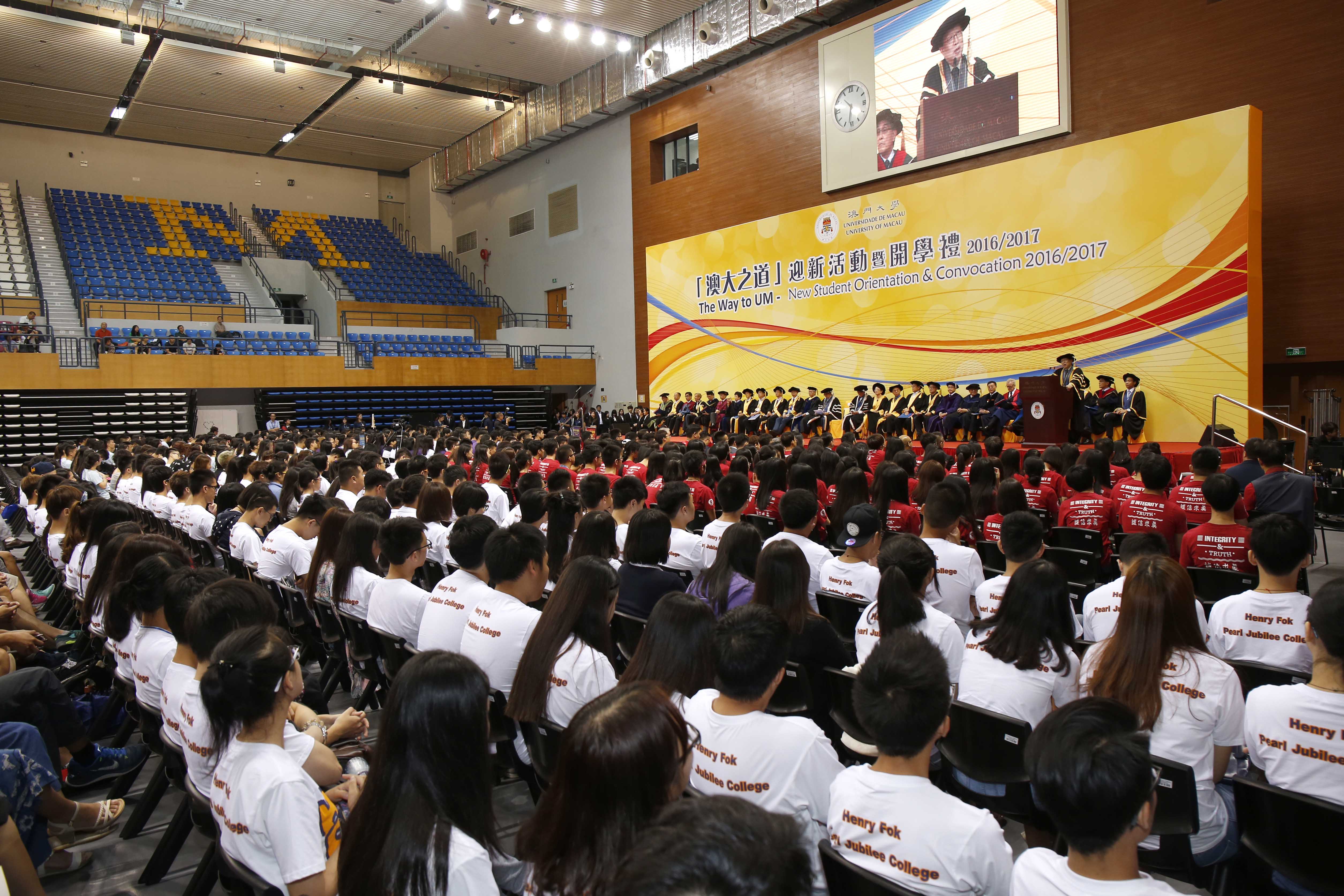 澳門大學今(16)日舉行2016/2017學年開學禮,喜迎約千五名新生,師生共聚一堂迎接新學年、新生活。澳大校長趙偉教授向新生講了第一堂課,勉勵他們珍惜大學四年的學習時光,善用澳大的“大樓、大師",宏揚“大博、大雅"的精神,讓生命更豐盛。