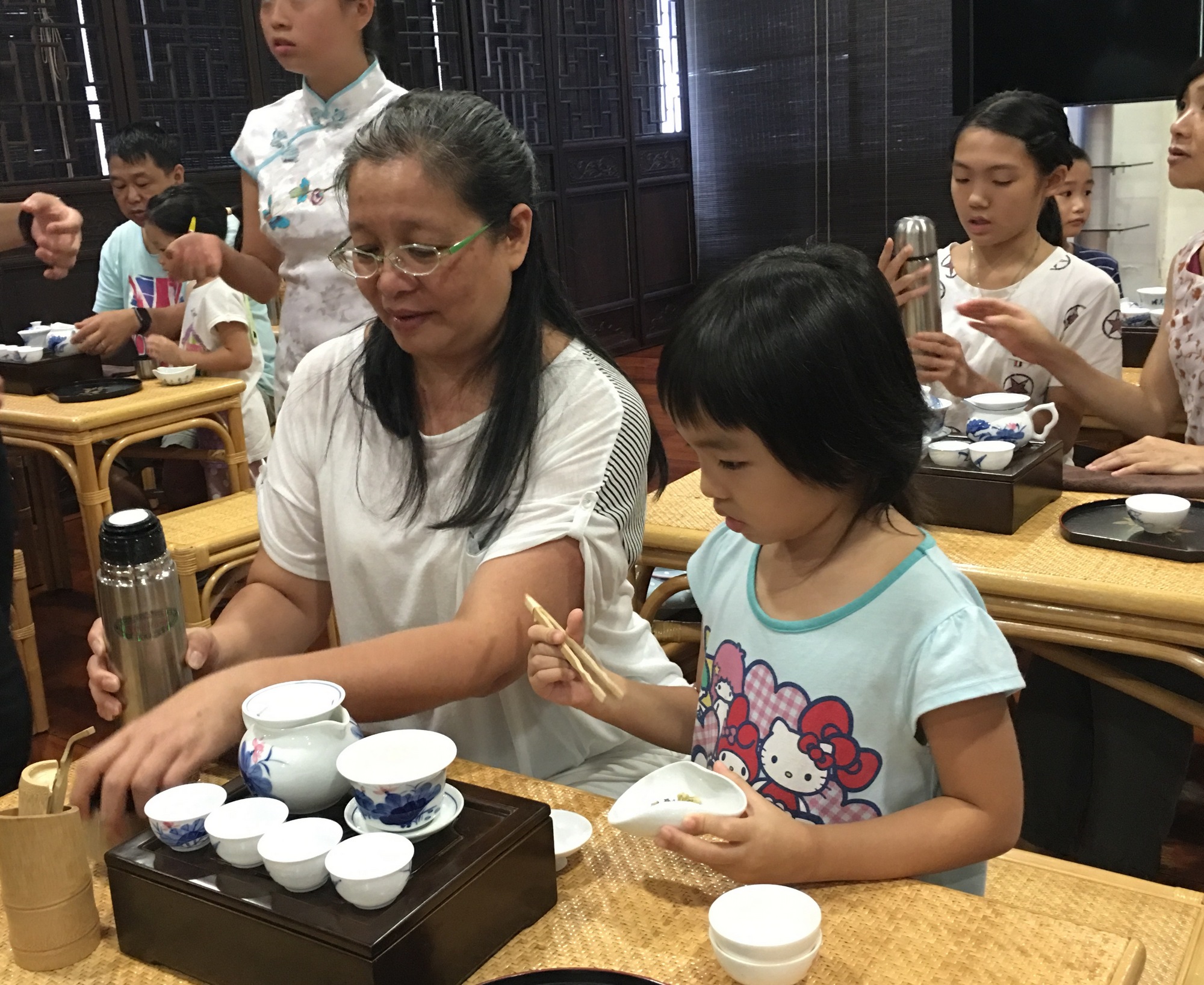 “親子茶藝工作坊”由澳門茶藝協會資深茶藝導師潘惠芬,以輕鬆活潑的方式介紹中國茶葉種類、製造方法、特性和茶具使用方法,藉此啓發兒童和家長的感官,引導參加者運用視覺、嗅覺、味覺和心靈來欣賞茶湯之色、香、味、形,並教授基本泡茶工藝及奉茶禮儀。是次參加的家庭中的小童成員的年齡層橫跨四歲至十五歲,為更好地照顧到每一位參加者的需要,除導師外,澳門茶藝協會亦安排了多位少年茶藝師到現場作協調,親身指導小童完成整個泡茶及奉茶過程。