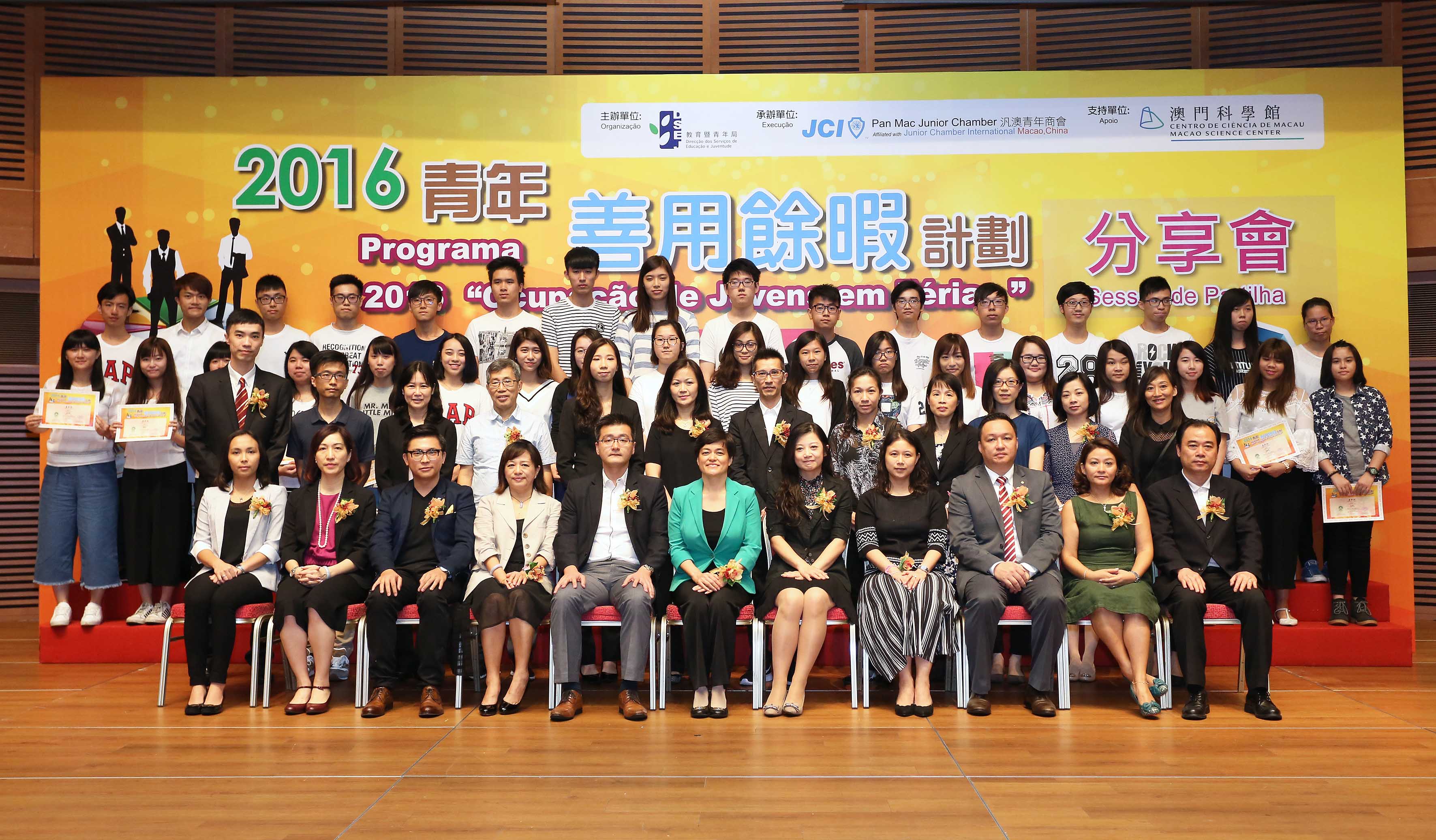 為配合“澳門青年政策”增進社會流動的政策方向,同時加強青年生涯規劃輔導工作,由教育暨青年局主辦、汎澳青年商會承辦、澳門科學館股份有限公司作為支持單位,以及澳門36個公共部門和私營機構共同參與推行的“青年善用餘暇計劃2016” 圓滿結束。本計劃共吸引了1,558名青年報名,甄選出438名青年參加。參加者參與了一系列的生涯規劃培訓及實習活動,計劃由2016年7月2日開始至8月26日結束。為答謝所有參與機構,以及向優秀實習生頒發獎狀,主辦單位於8月27日(星期六)下午3時假澳門科學館舉辦了分享會。