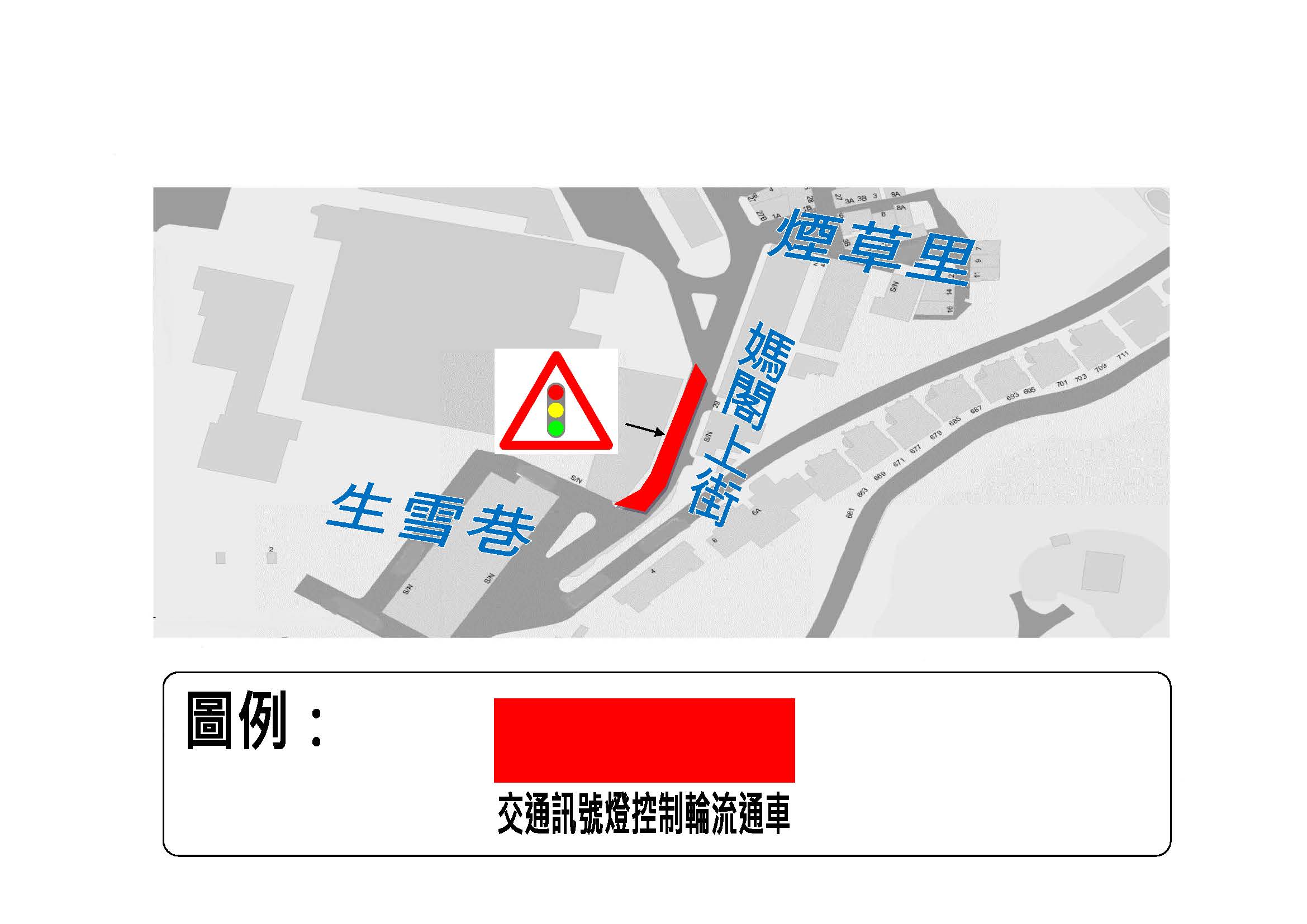配合接駁街渠、水管及沙井管道鋪設工程,9月7日(周三)上午10時起,介乎煙草里與生雪巷之間的一段媽閣上街,實施交通訊號燈控制下之單一車道輪流通車,工程地點部份車輛錶咪泊車位會暫停使用,為期20日。交通事務局呼籲駕駛者留意有關交通改動,並遵守路上設置的臨時交通標誌行車。如欲了解詳情,可登入交通事務局網頁www.dsat.gov.mo。