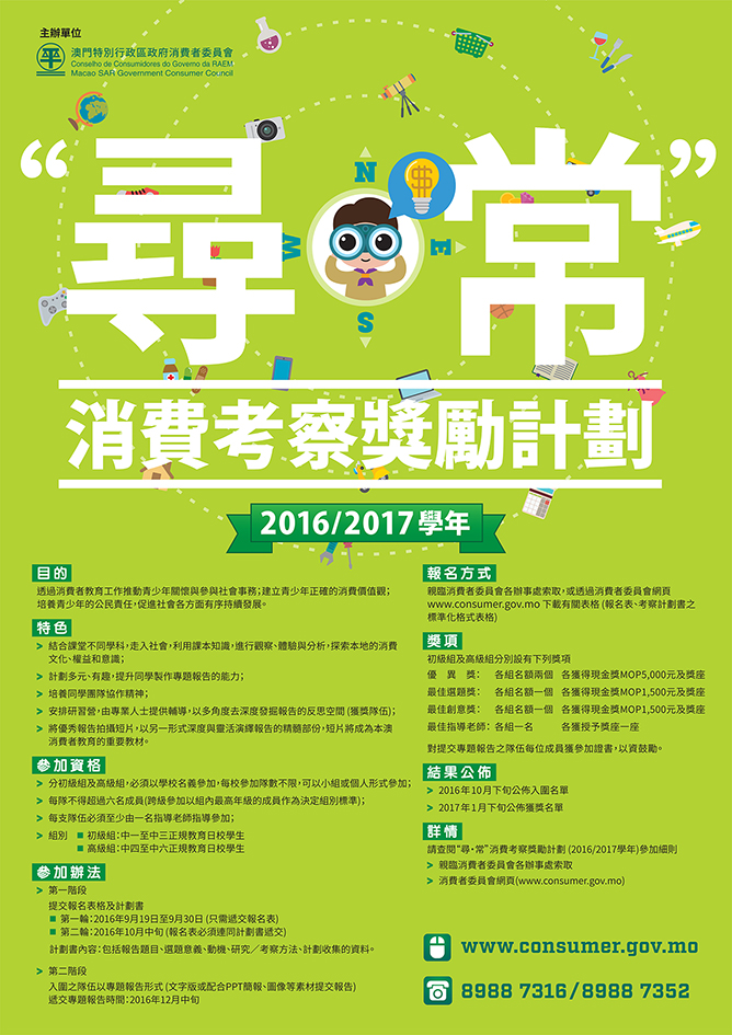 為培養青少年正確的消費價值觀;認識消費者的權利與義務,消委會以中學生為對象舉辦“尋・常”消費考察獎勵計劃(2016/2017學年),計劃第一段階為徵集考察報告的計劃書,收件期由即日起至10月20 日止,該會將在9月份舉辦多場說明會,向有興趣參加的學校介紹該計劃的詳情,歡迎各中學校報名參加。