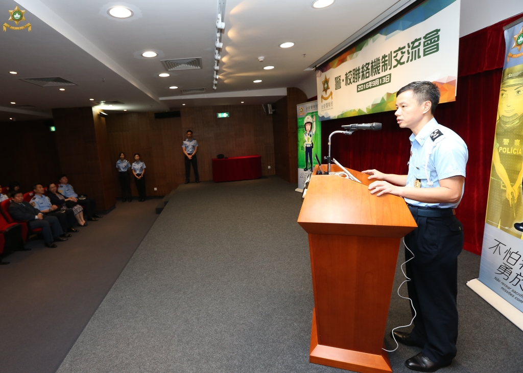 關啓榮代副局長致辭時表示,治安警察局一向重視全澳學生的健康發展,當中預防校園犯罪為治安警察局的重點工作,要解決校園犯罪問題,必須從教育、輔導及預防工作上着手,而家庭、學校及警方三方相互配合才可事半功倍。治安警察局積極與各間學校保持緊密聯繫和合作,恆常派遣警官拜訪各間學校與校方互通警情,將與學生有關的犯罪訊息及最新的防罪資訊傳遞給學校,並聽取校方有關校內及學校周邊範圍的治安訴求,制定針對性的打擊犯罪措施。另外亦於校園內外推廣防罪宣傳教育工作,因應不同年齡層的學生舉辦各種不同主題的防罪教育講座或活動,向學生灌輸防罪滅罪及守法意識。校方亦一直積極配合警方開展相關工作,盼望日後雙方繼續保持密切溝通和合作。