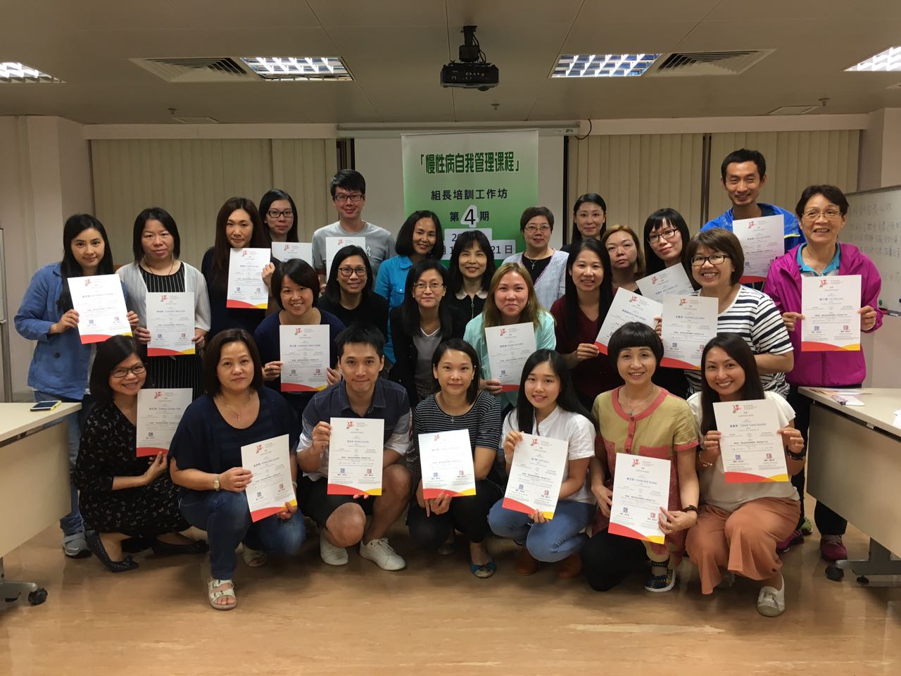 為協助前線健康教育工作者推行慢性病自我管理,讓他們掌握開展「慢性病自我管理課程」的技巧,提升開展課程的信心。衛生局與慢性病防制委員會於2016年9月13、14、20及21日合辦第4期「慢性病自我管理課程」組長培訓工作坊,是次工作坊邀請了有豐富經驗的香港復康會導師來澳授課,報名反應十分熱烈,共錄取24名學員,全部學員均完成4天培訓並獲頒發證書。