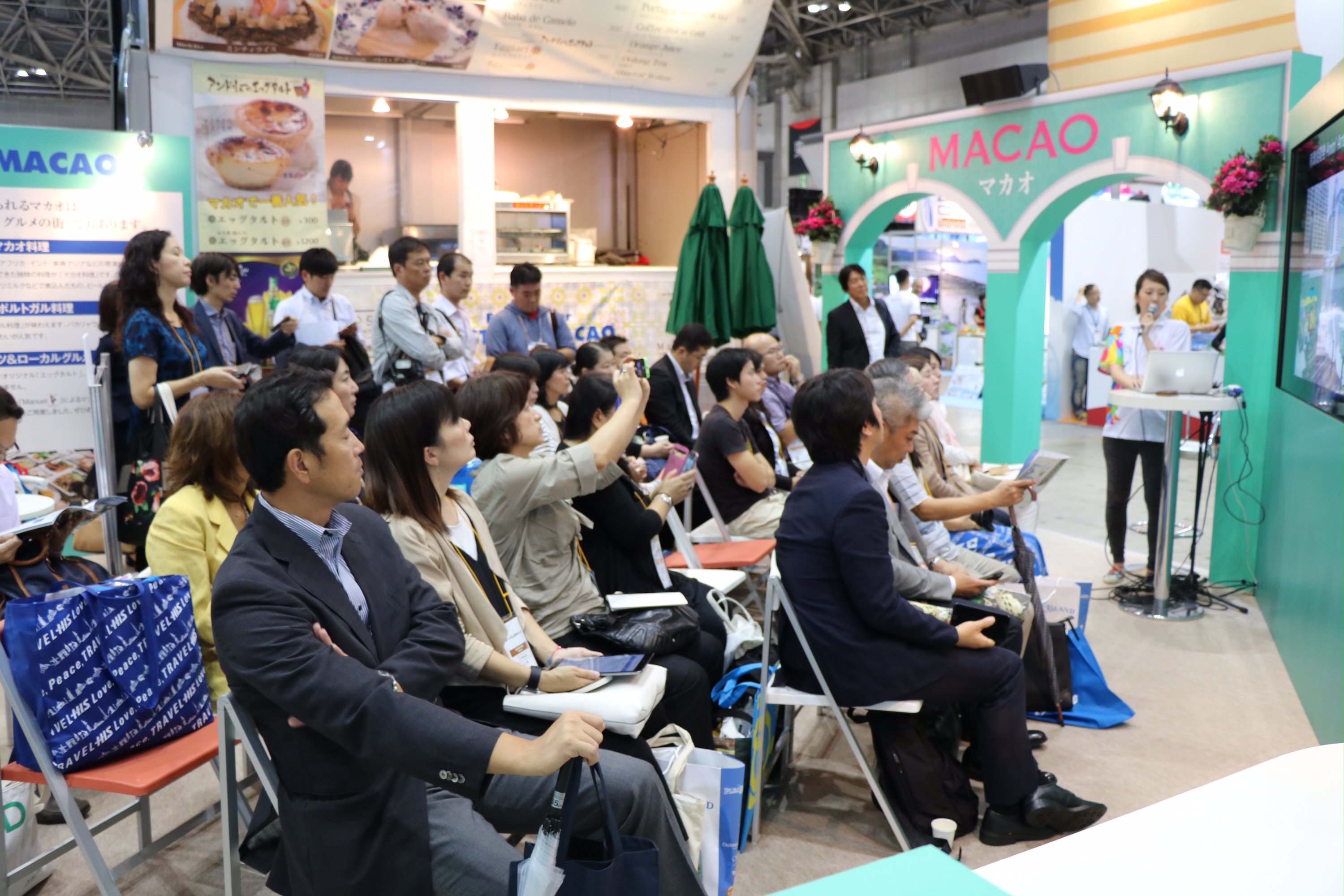 旅遊局今年於日本旅遊博覽會所設的展位圍繞世界遺產的主題設計,並提供虛擬實景遊覽澳門的體驗作爲亮點。與會者帶上虛擬實景裝置,即可踏上澳門之旅,以鳥瞰角度欣賞澳門歷史遺產及最新旅遊設施,體驗澳門格蘭披治大賽車的刺激賽道,最後縱身躍下澳門旅遊塔,以笨豬跳結束精彩旅程,並為博覽會周末舉行的消費者專場特設澳門美食車,由兩家澳門餐飲企業供應地道美食。