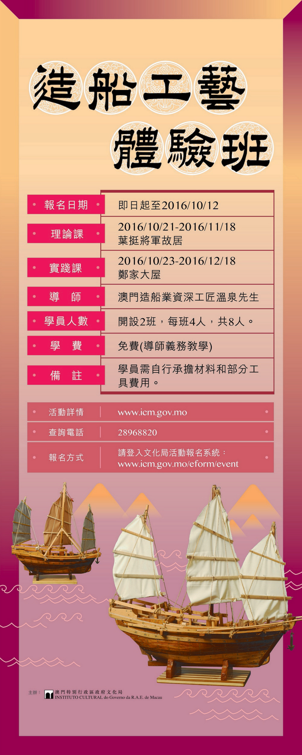 “造船工藝體驗班”以廣東話授課,學費全免,但學員需自行承擔製作帆船模型的材料及部分工具的費用。報名可登入文化局網頁www.icm.gov.mo/eform/event,查詢可於辦公時間內致電二八九六八八二零。