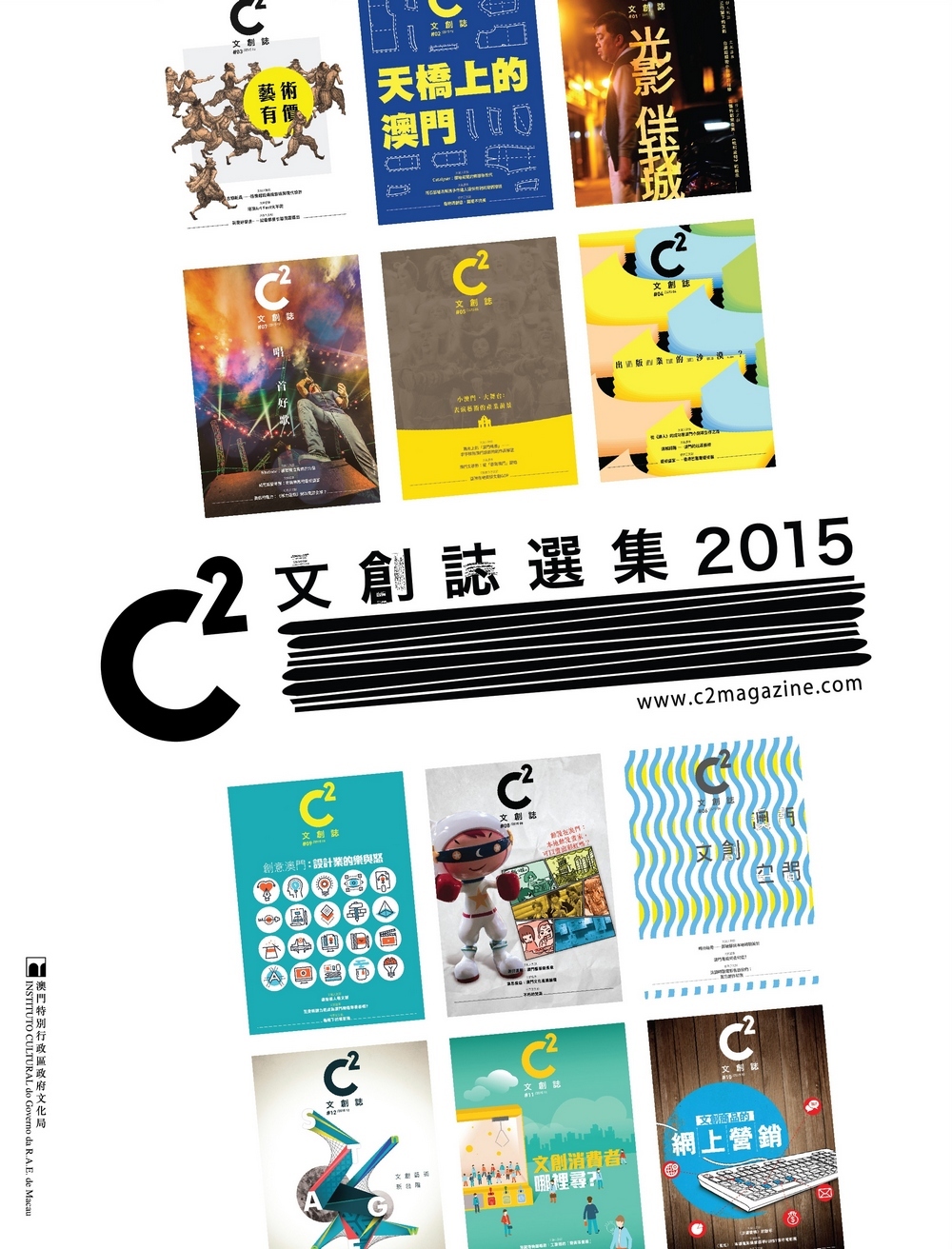 為促進澳門文化創意產業資訊交流、展示澳門文創發展現況、推廣澳門文創品牌、加強大眾對文創產業的認識和關注,以及豐富城巿的文創氛圍,文化局自二零一五年一月起創辦《C2文創誌》電子雜誌(www.c2magazine.mo),雜誌設有中、葡、英三種語文,由佰家文化創意發展有限公司製作,推出以來得到不少讀者支持,關注人數與日俱增。為讓讀者回顧去年《C2文創誌》的精彩報道,引發讀者、文創業界有更多的討論、交流和合作可能性,文化局從十二期《C2文創誌》的五個欄目,包括“文創焦點”、“文創人對談”、“文創盛事”、“世界正文創”及“文創博客”,精選六十篇文章,彙編成《C2文創誌選集二零一五》,綜合展示澳門文創在電影、時裝、視覺藝術、出版、設計、音樂及動漫等範疇的創新思維、獨特構想及發展狀況。