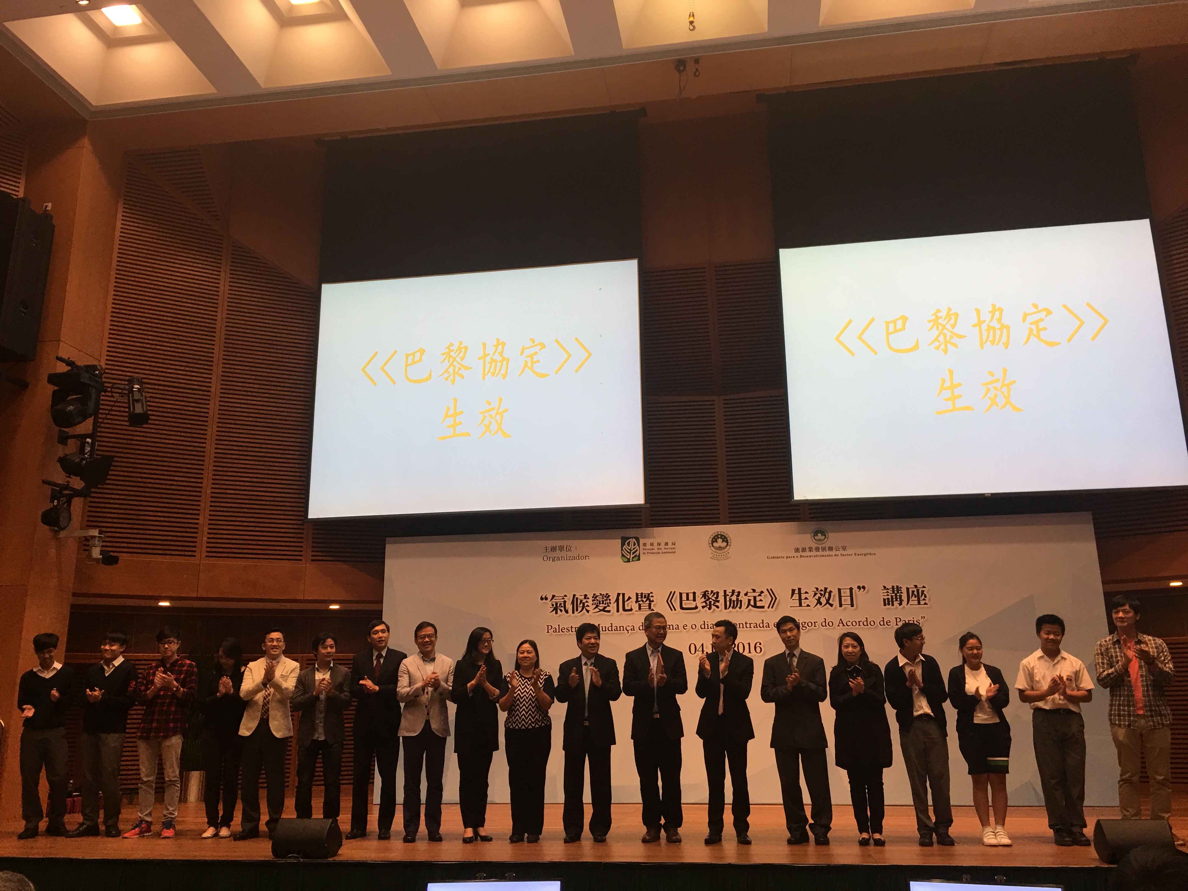 為提升市民對氣候變化及《巴黎協定》的認識,地球物理暨氣象局聯同環境保護局、能源業發展辦公室於今日(4日)下午4時半至6時,假澳門科學館會議中心合辦“氣候變化暨《巴黎協定》生效日”講座。講座吸引超過200人出席,包括政府氣候變化跨部門專責小組、能源業、環保團體、環保酒店、以及慈幼中學、培正中學和教業中學等綠色學校師生。