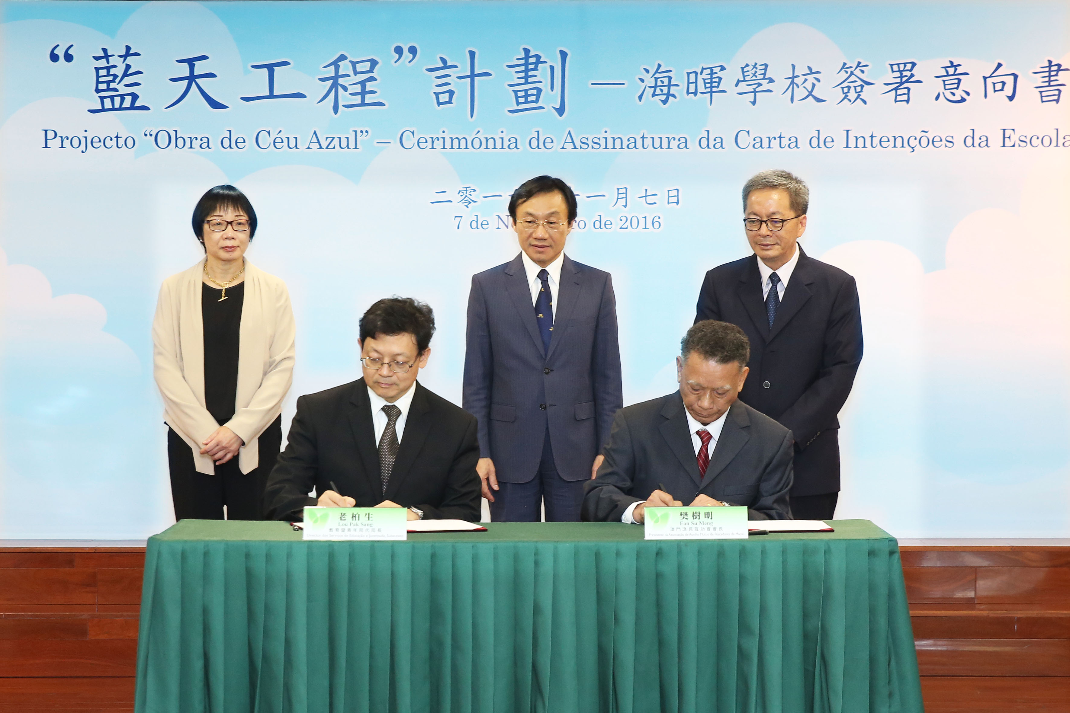 2016年11月7日,在社會文化司司長譚俊榮見證下,教育暨青年局代局長老柏生與海暉學校的辦學實體澳門漁民互助會會長樊樹明簽署參與“藍天工程”的意向書,接受在北區中葡小學現址重建作為海暉學校新校舍。