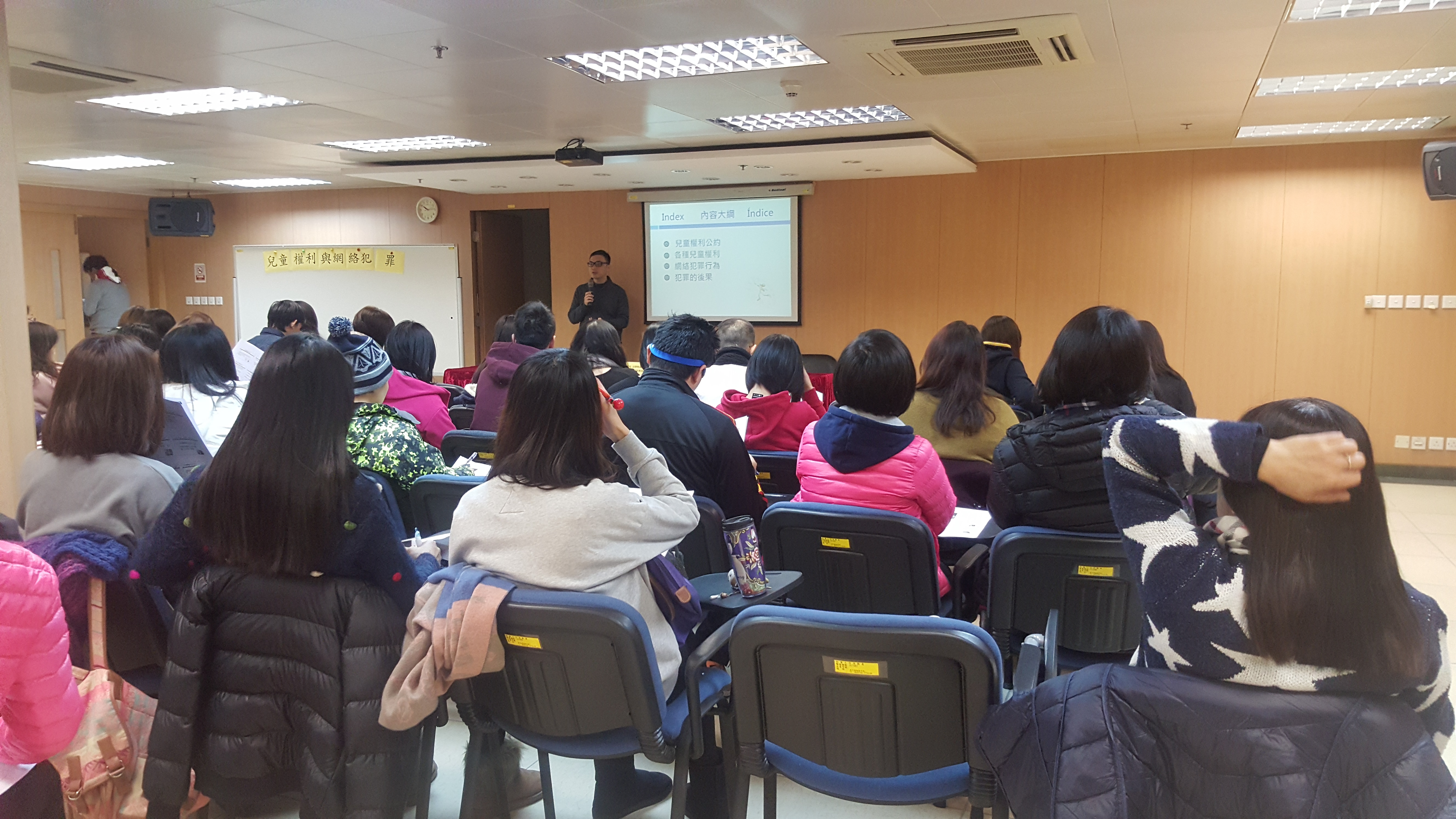 自2016年1月至10月期間,社會工作局聯同法務局向317名來自澳門大學、澳門鏡湖護理學院、聖若瑟大學之大專生,以及50名從事兒童/青少年、家庭及社區服務之工作人員,參與了四場「兒童權利與網絡犯罪」講座。法務局高級技術員林強俊先生講解有關《兒童權利公約》、網絡犯罪的相關法律、規定以及預防措施等。在互動環節上,與會者踴躍發問,就關注議題與講者進行交流。